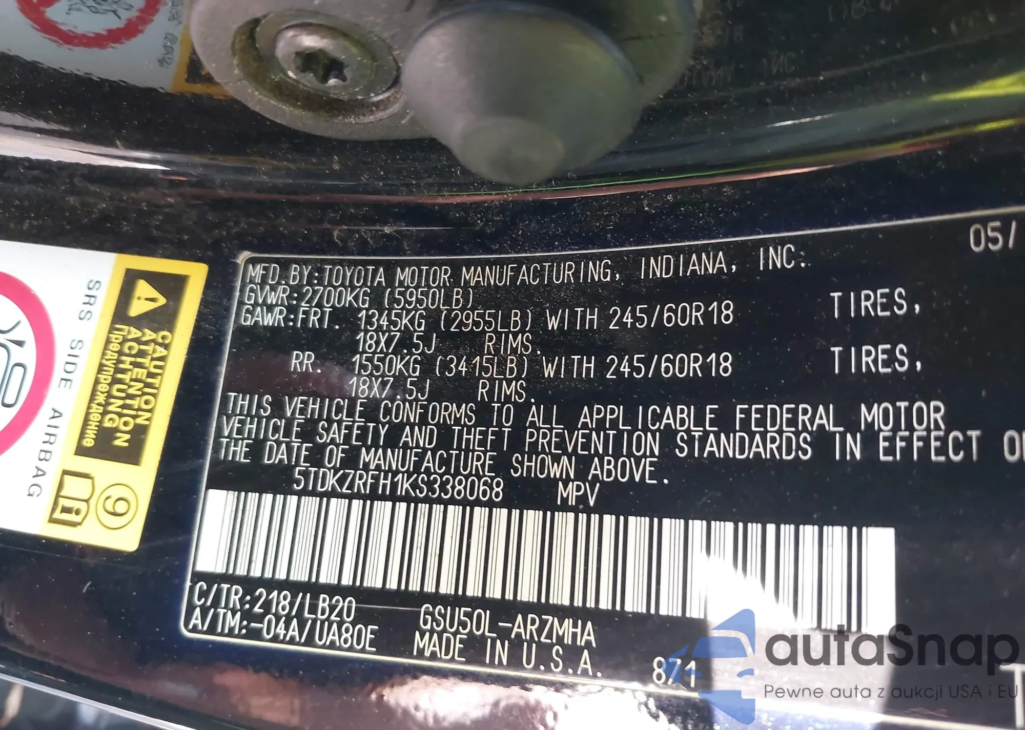 • VIN 5TDKZRFH1KS338068