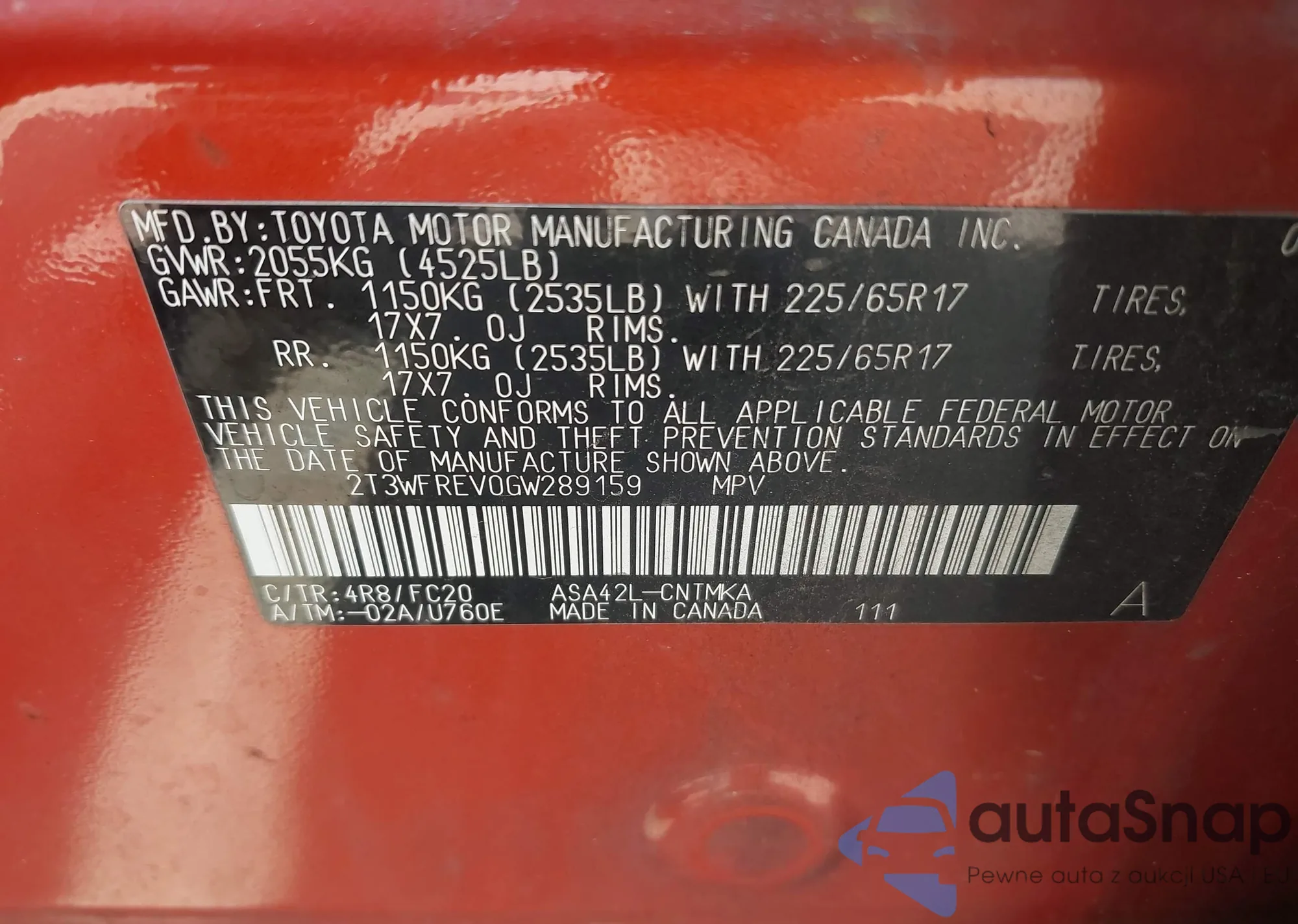 LOT: 42675438 VIN: 2T3WFREV0GW289159