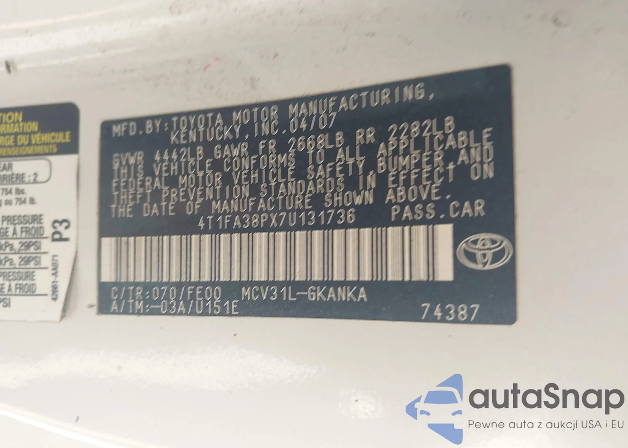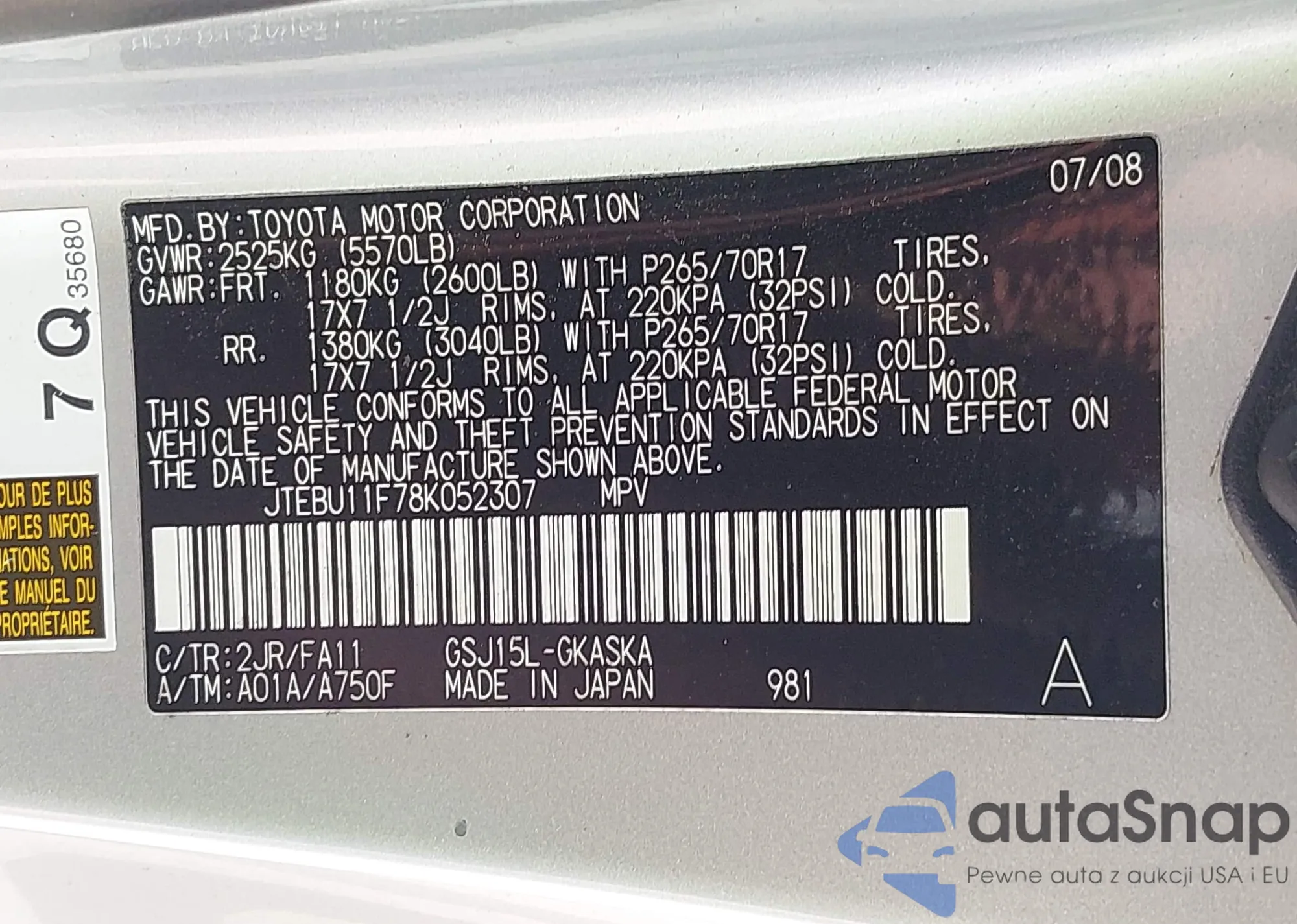 LOT: 42903069 VIN: JTEBU11F78K052307