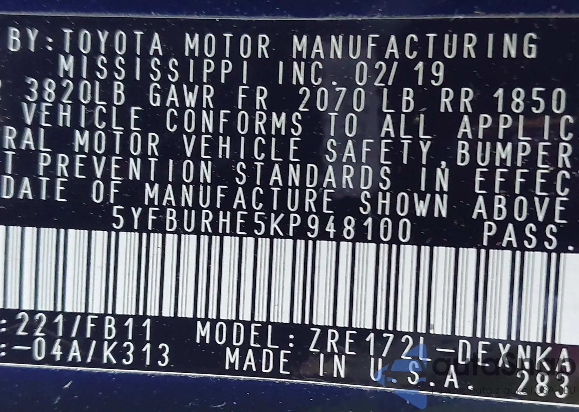 • VIN 5YFBURHE5KP948100