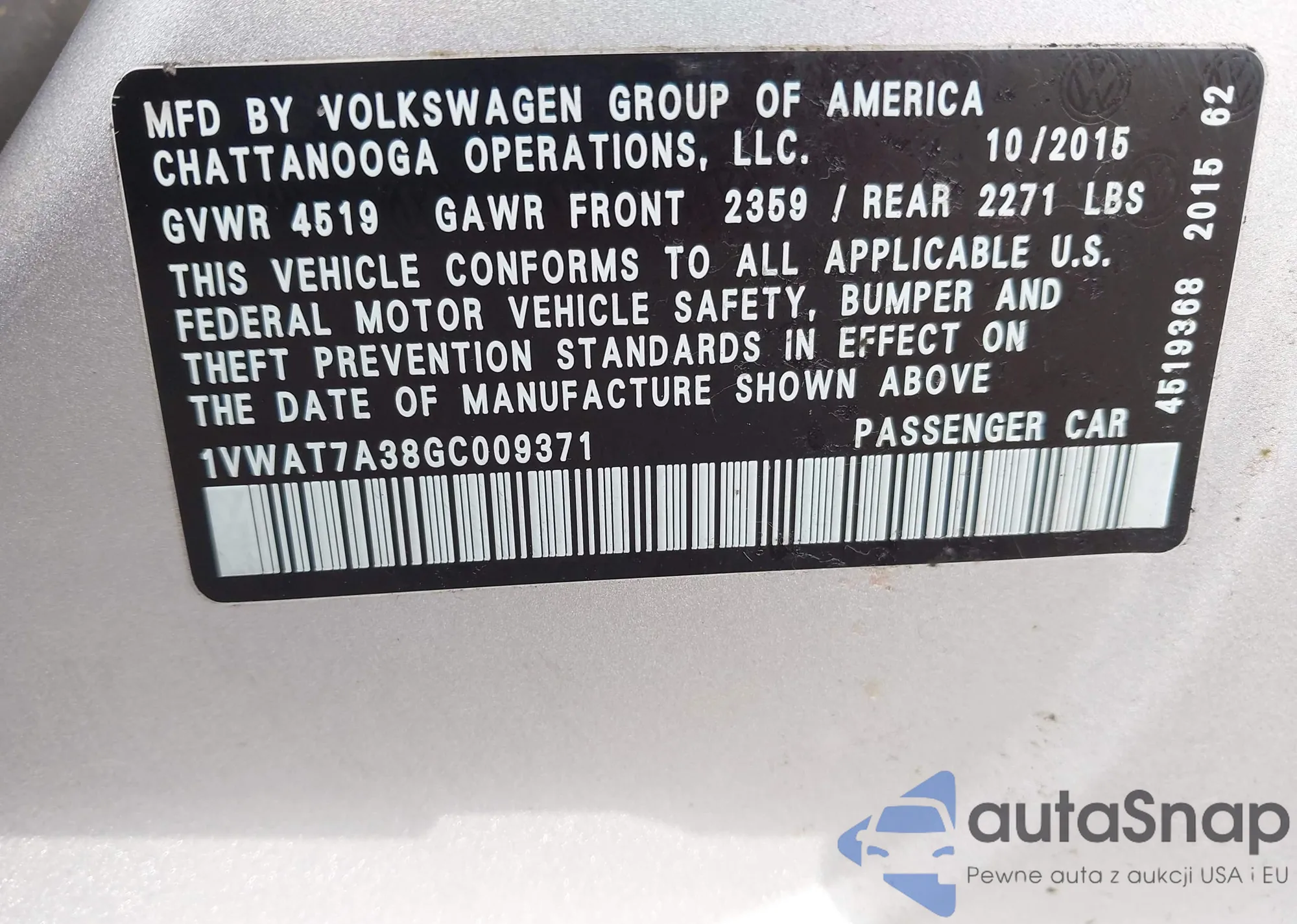 • VIN 1VWAT7A38GC009371