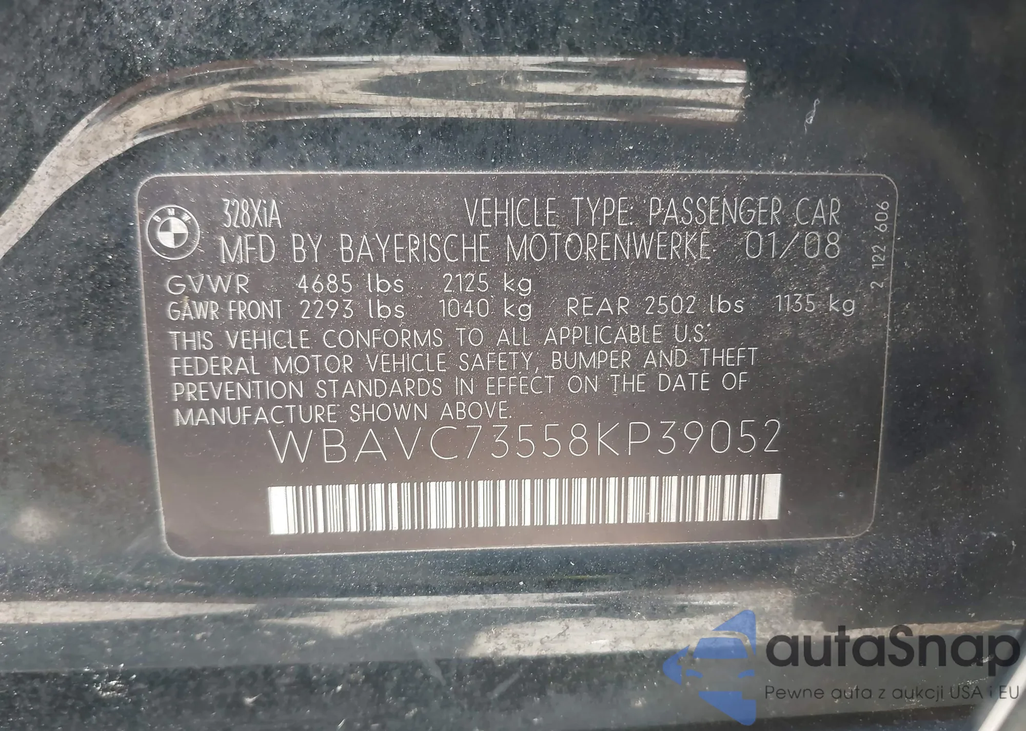 LOT: 42936934 VIN: WBAVC73558KP39052