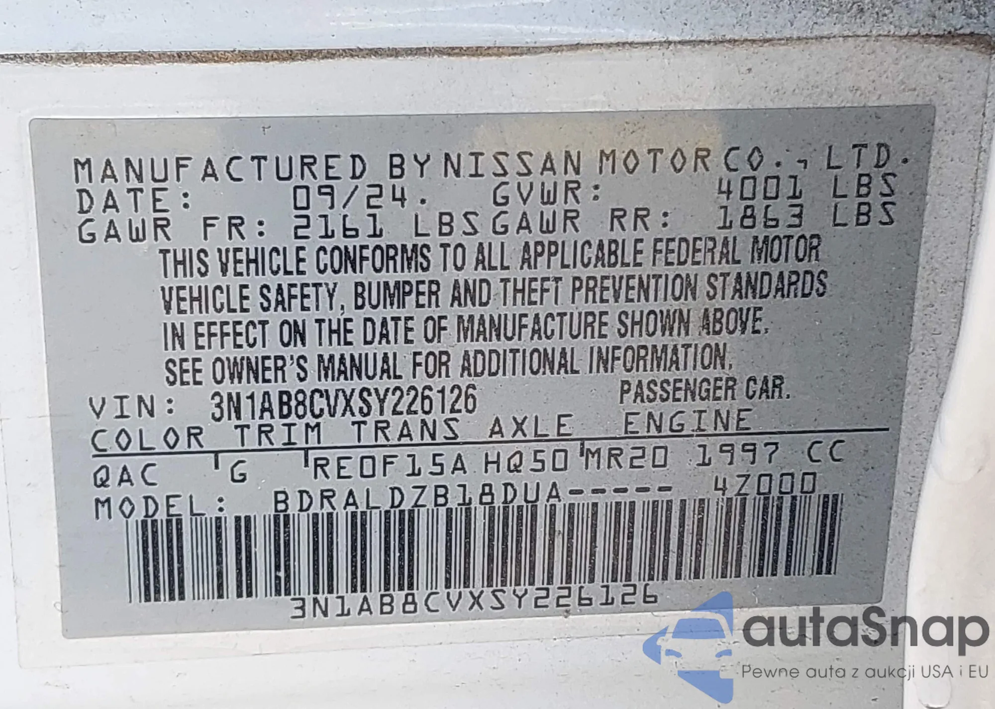 LOT: 43031370 VIN: 3N1AB8CVXSY226126