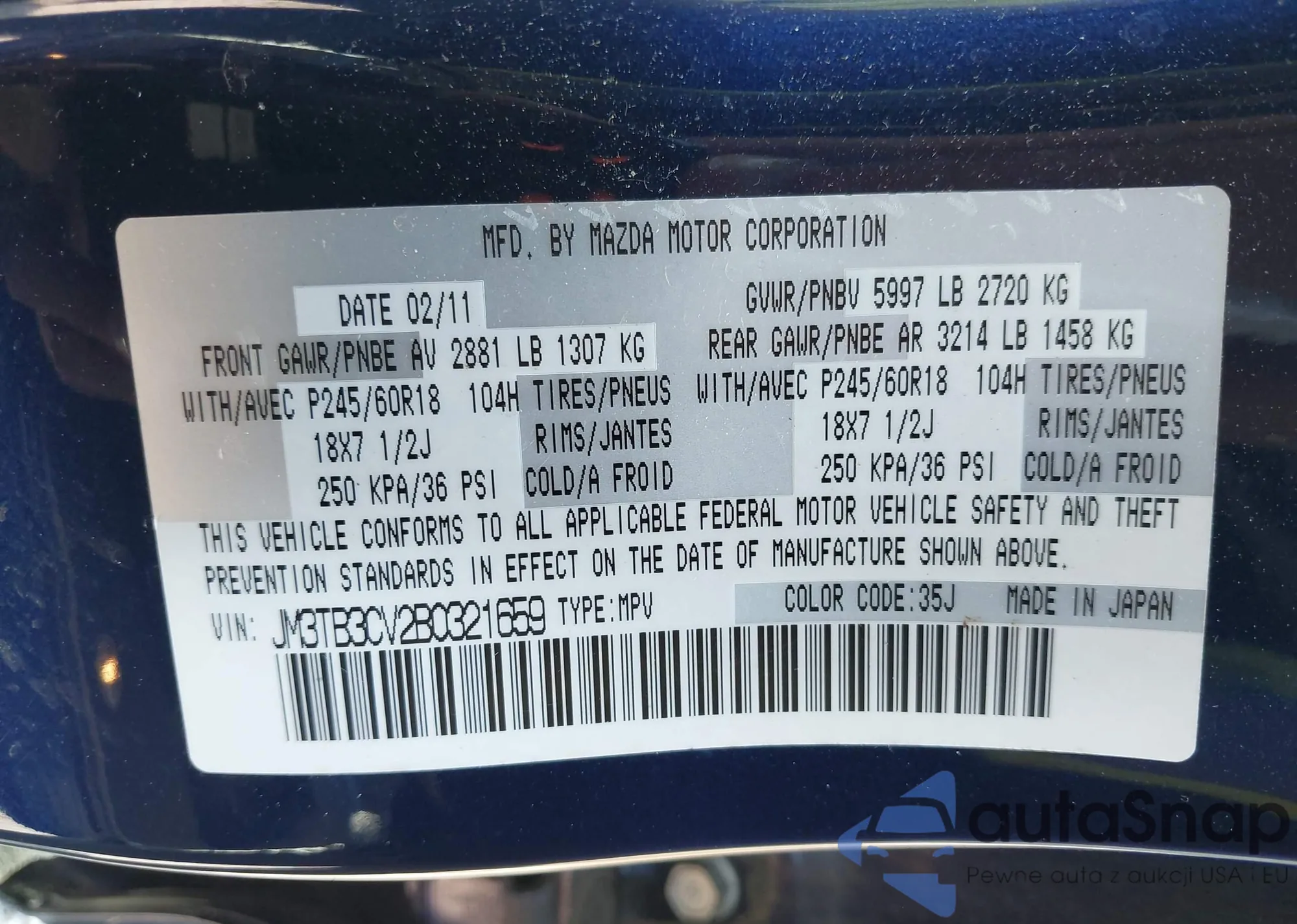 2011 Mazda Cx-9 Touring из США, поврежденный, VIN JM3TB3CV2B0321659