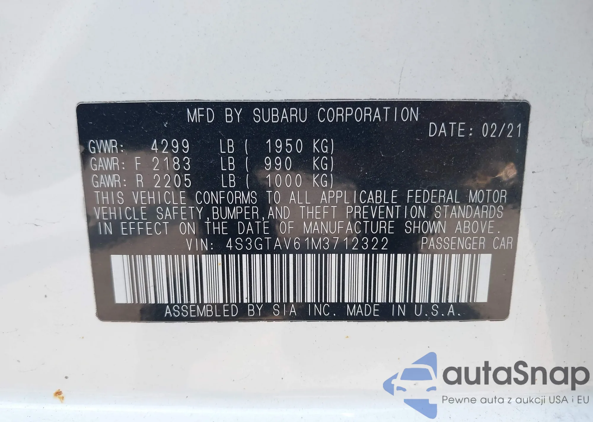 • VIN 4S3GTAV61M3712322