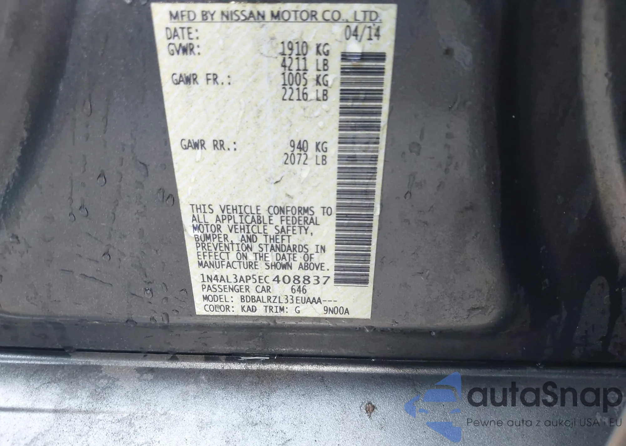 LOT: 43053939 VIN: 1N4AL3AP5EC408837