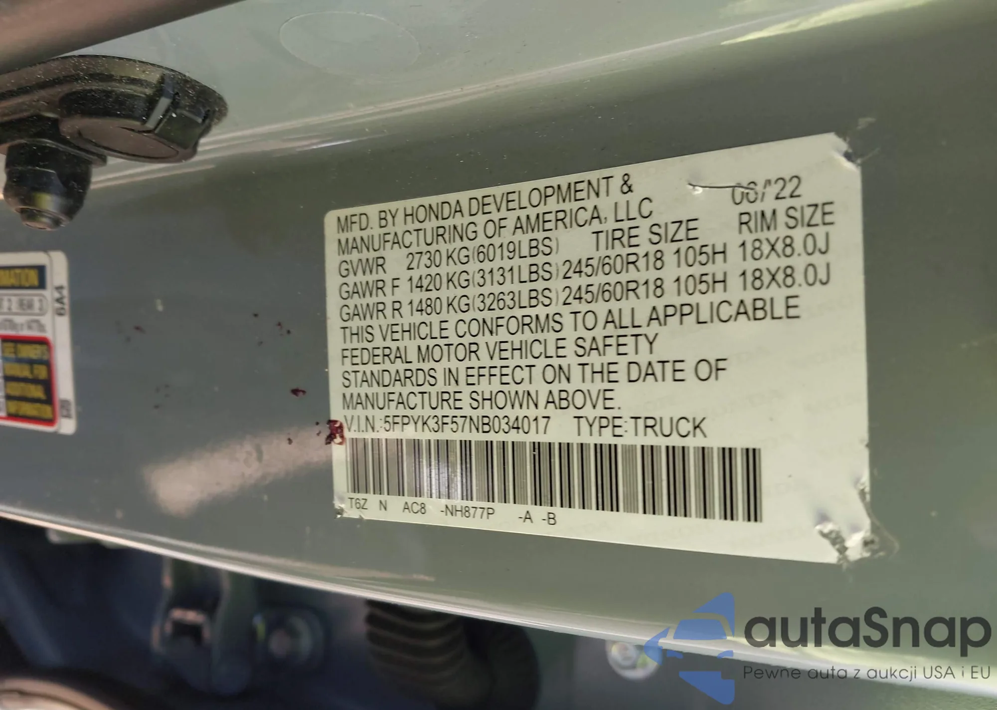 LOT: 38268102 VIN: 5FPYK3F57NB034017