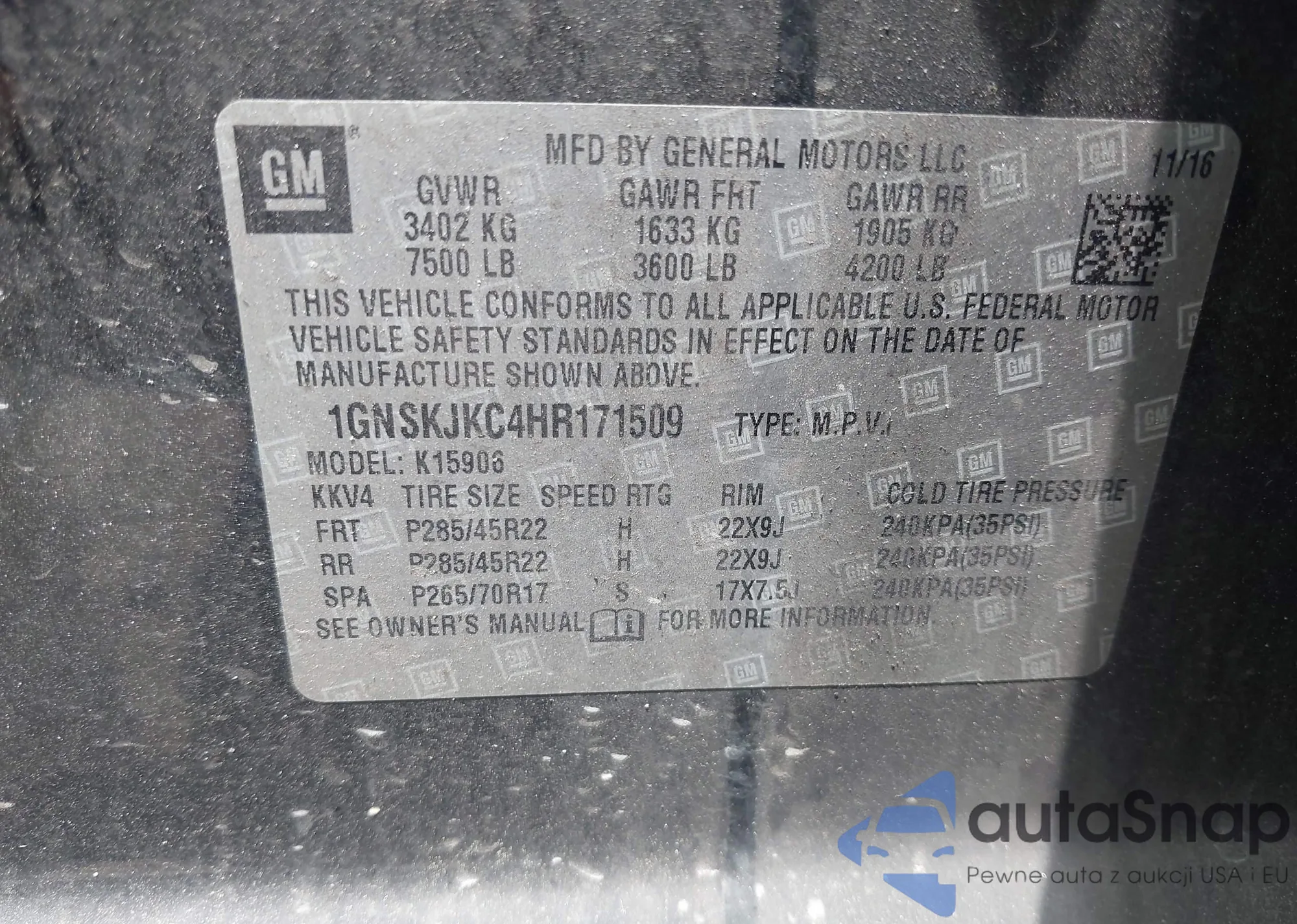• VIN 1GNSKJKC4HR171509
