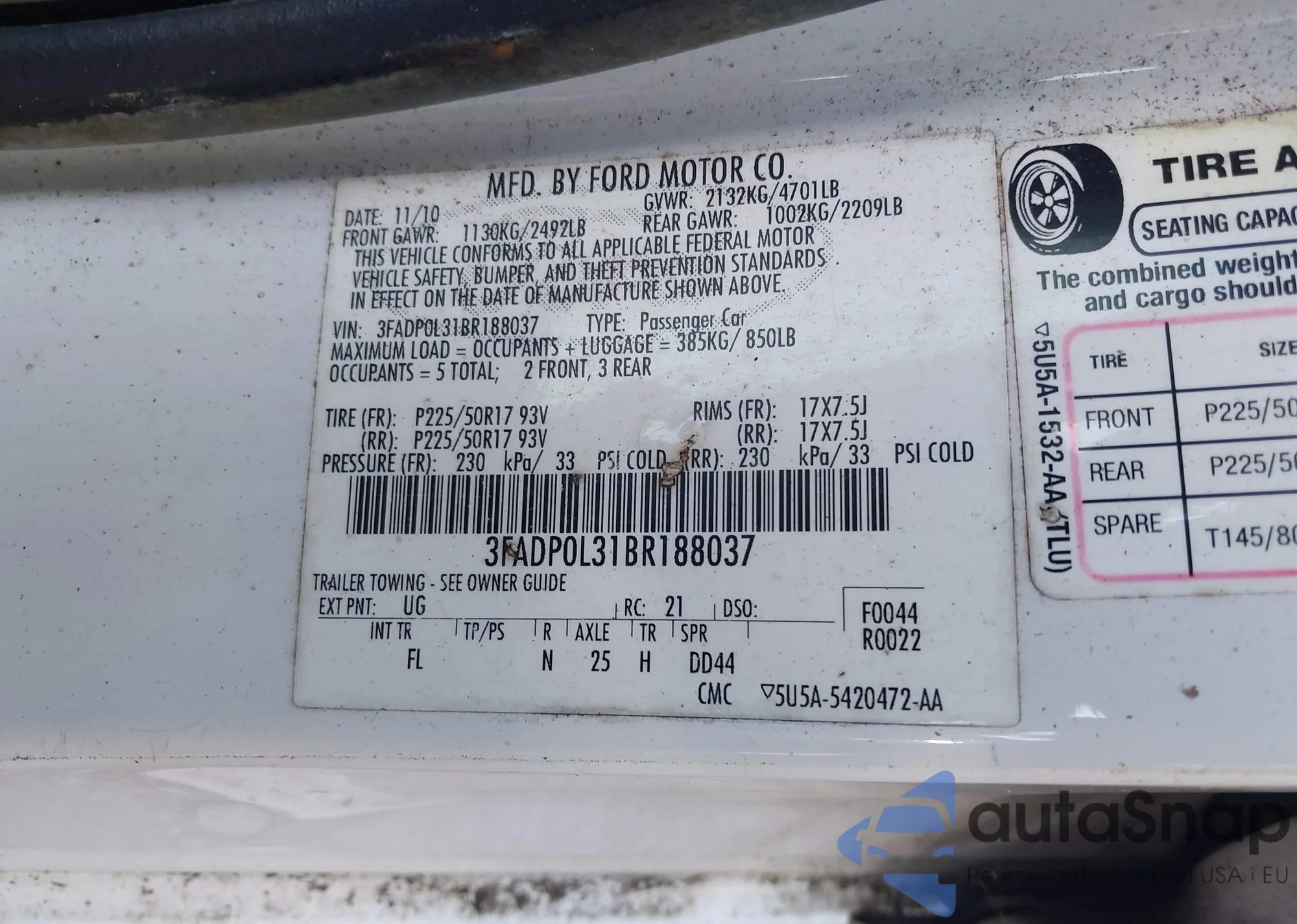 LOT: 42886733 VIN: 3FADP0L31BR188037