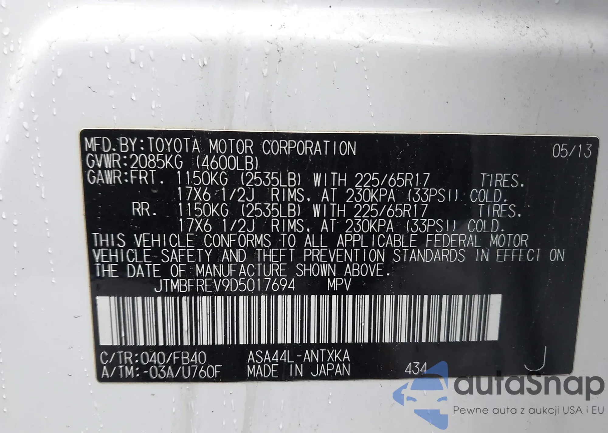 LOT: 41858384 VIN: JTMBFREV9D5017694