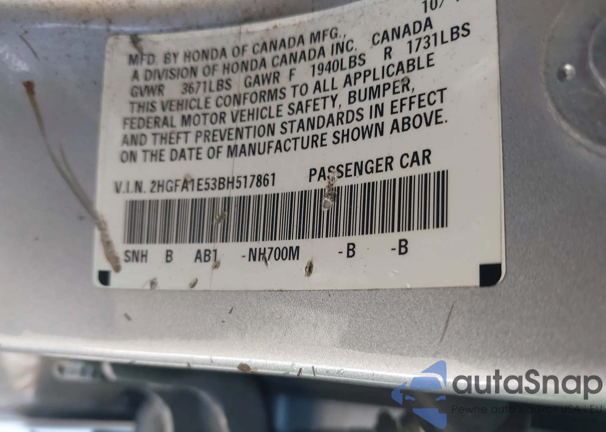 • VIN 2HGFA1E53BH517861