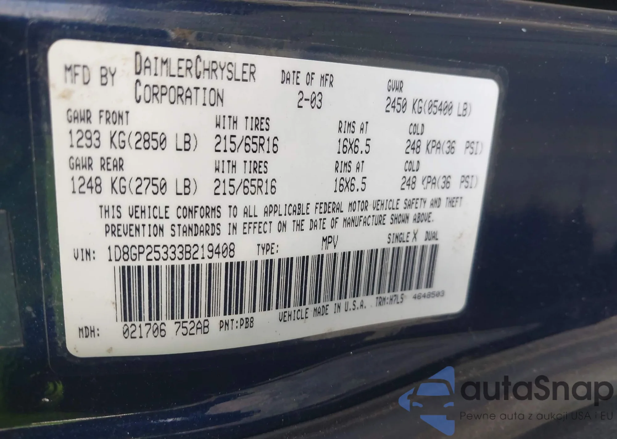 LOT: 43018106 VIN: 1D8GP25333B219408