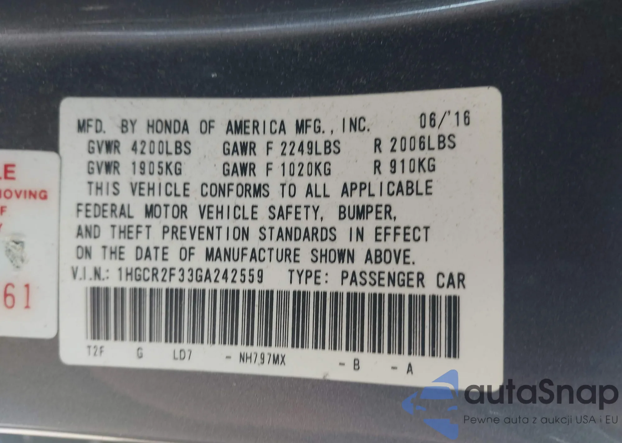 LOT: 42588557 VIN: 1HGCR2F33GA242559