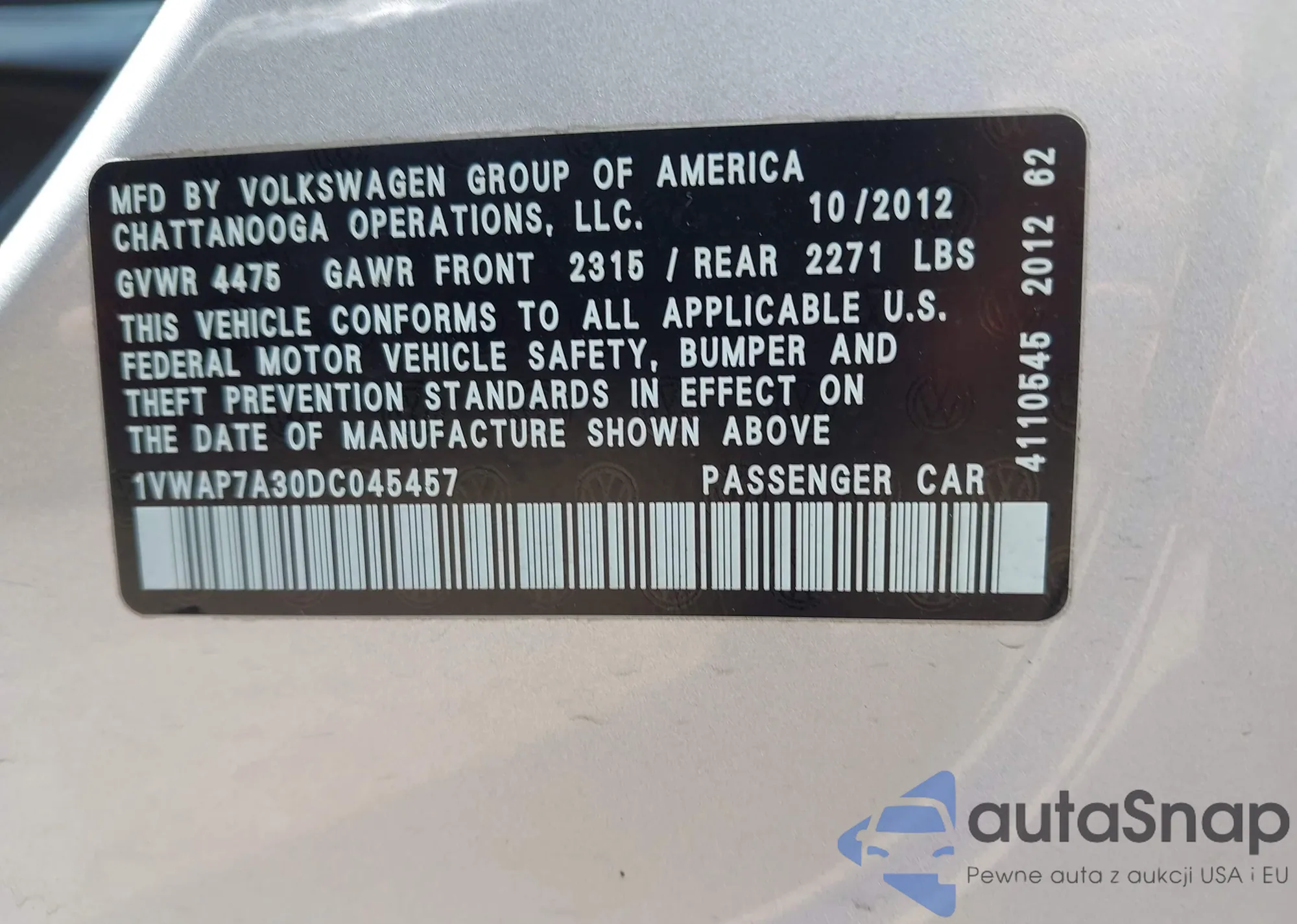 • VIN 1VWAP7A30DC045457