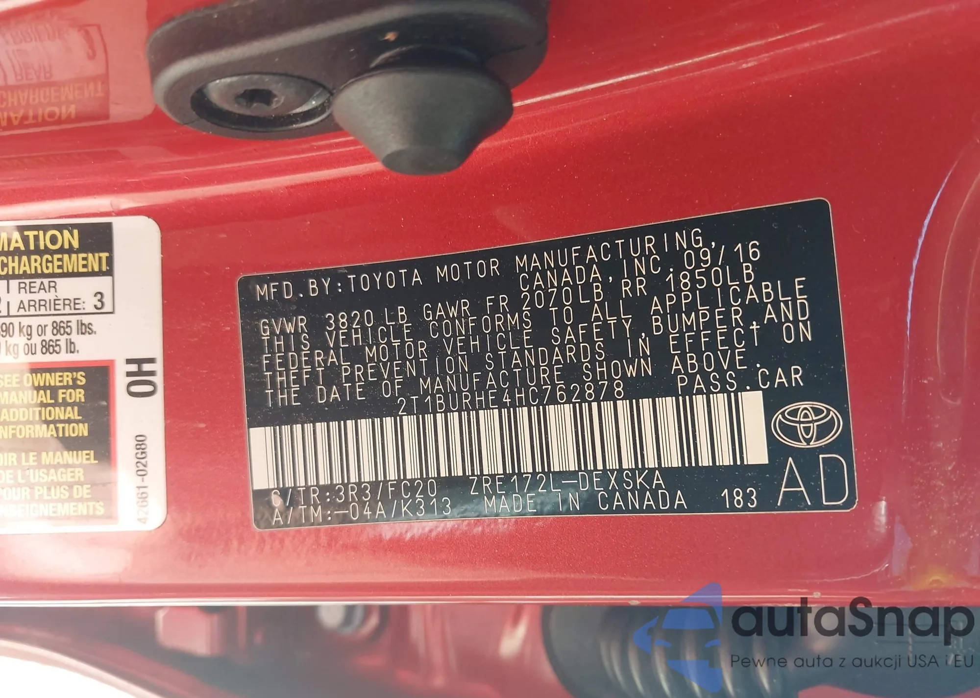 LOT: 42798812 VIN: 2T1BURHE4HC762878