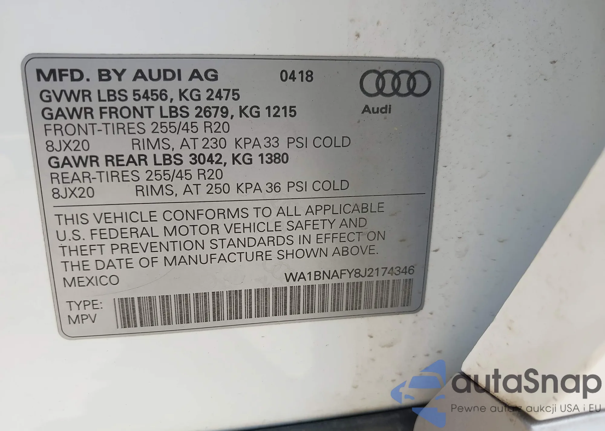 LOT: 42893517 VIN: WA1BNAFY8J2174346
