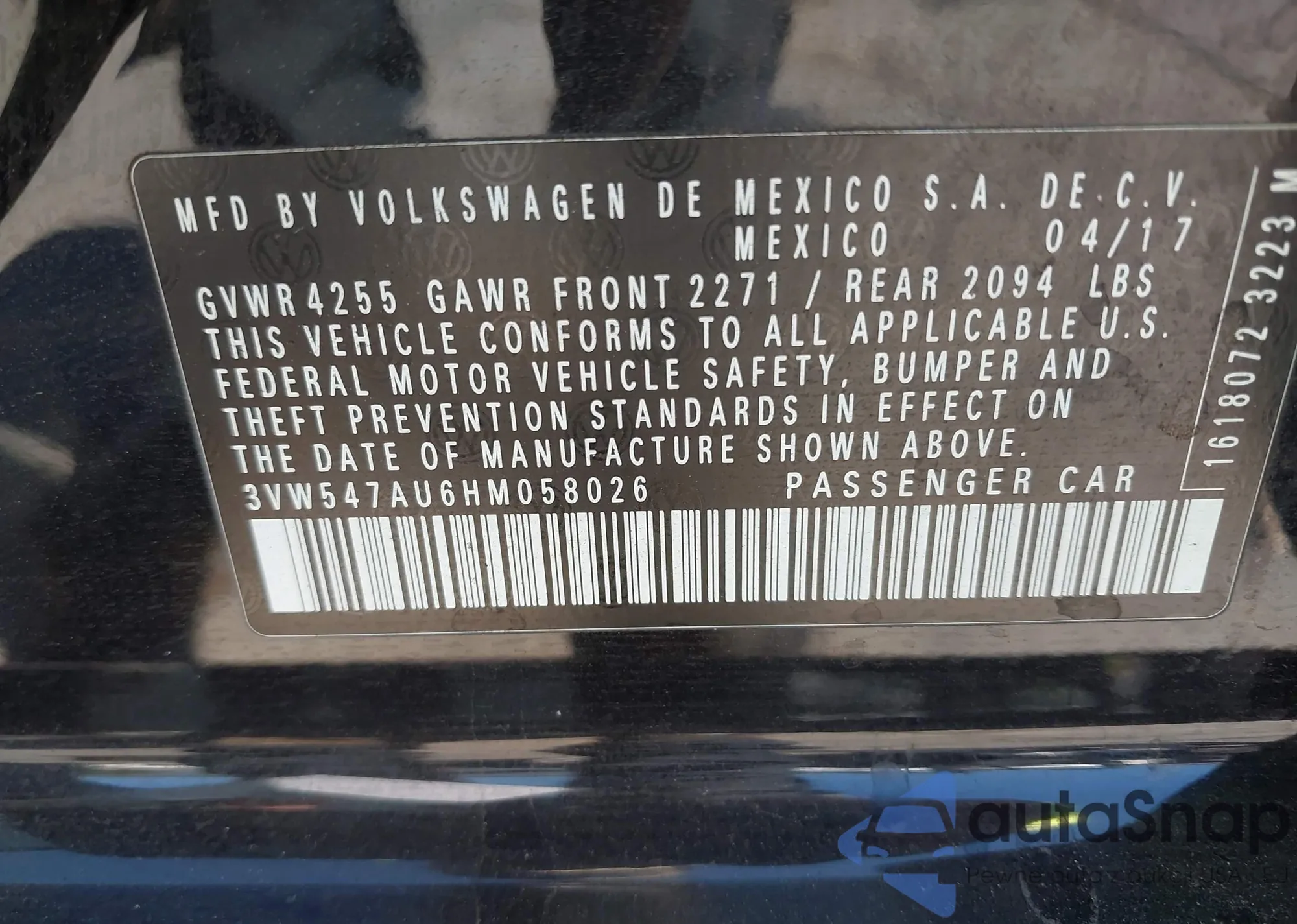 • VIN 3VW547AU6HM058026
