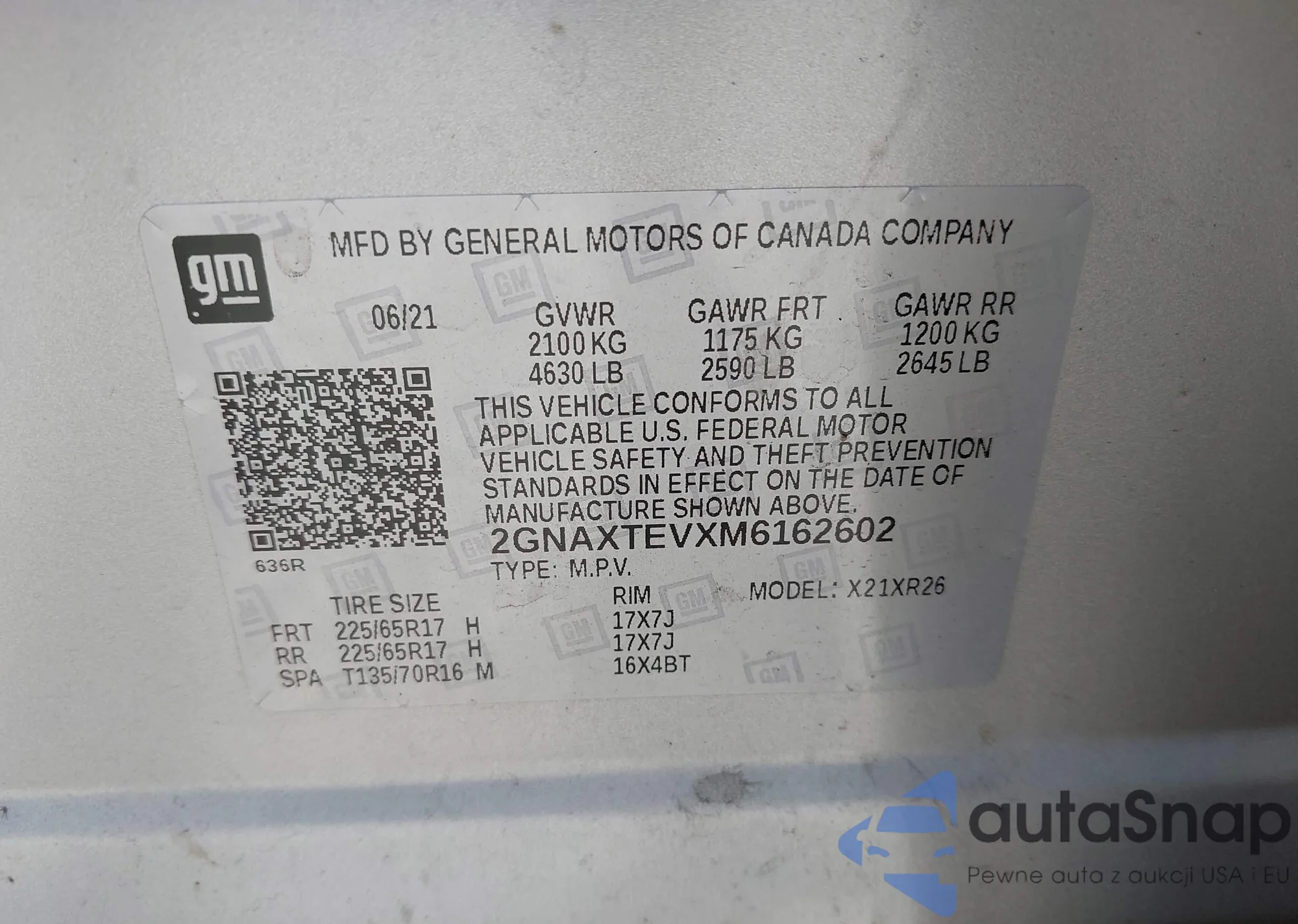 LOT: 42924647 VIN: 2GNAXTEVXM6162602