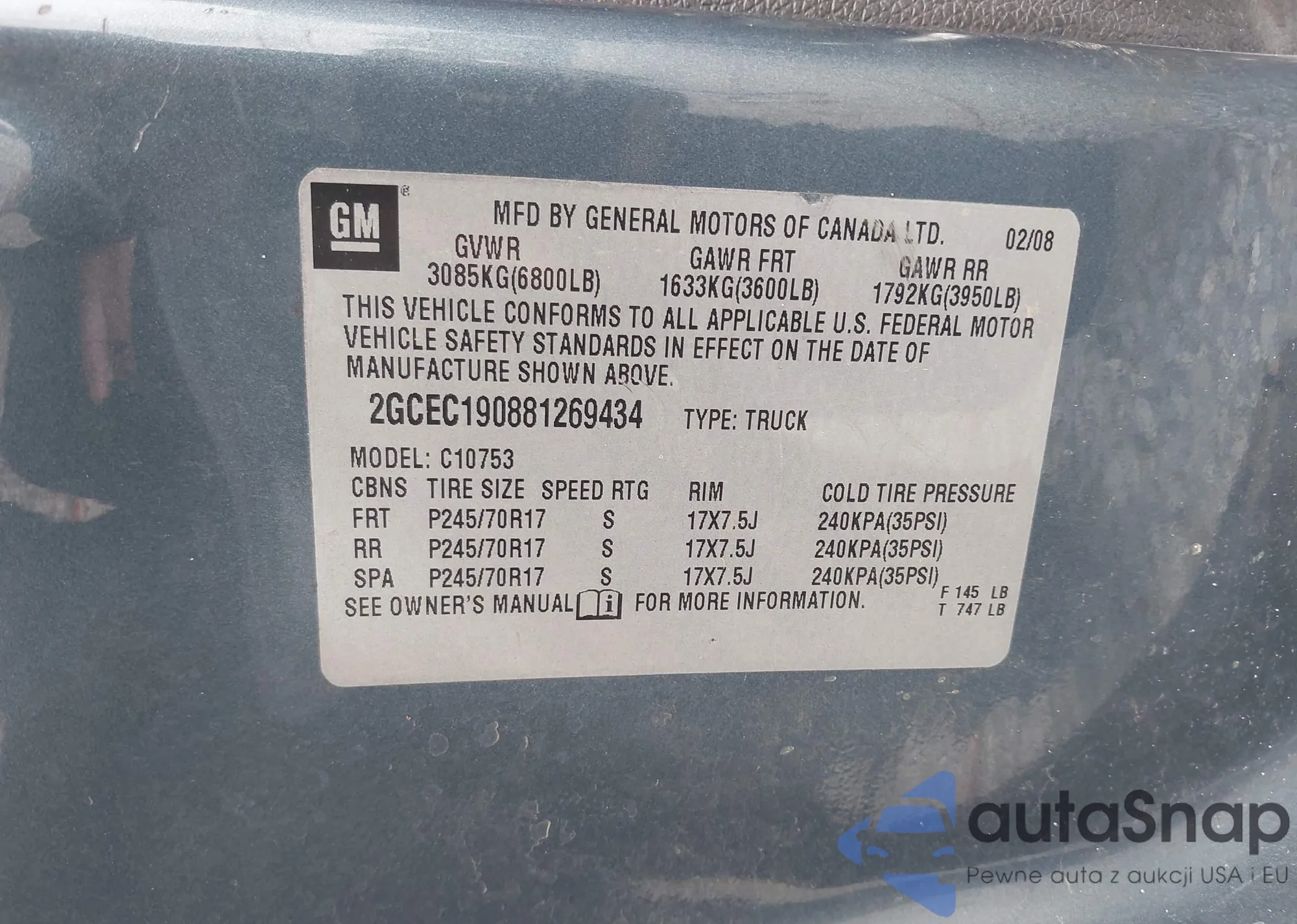 LOT: 43054937 VIN: 2GCEC190881269434