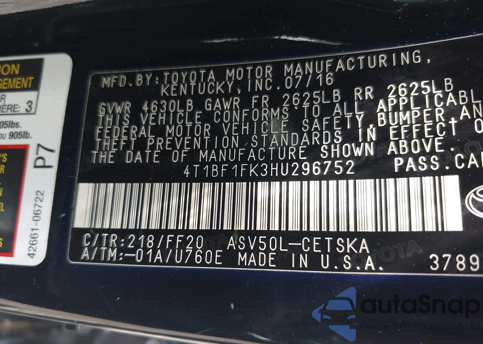 LOT: 42682365 VIN: 4T1BF1FK3HU296752