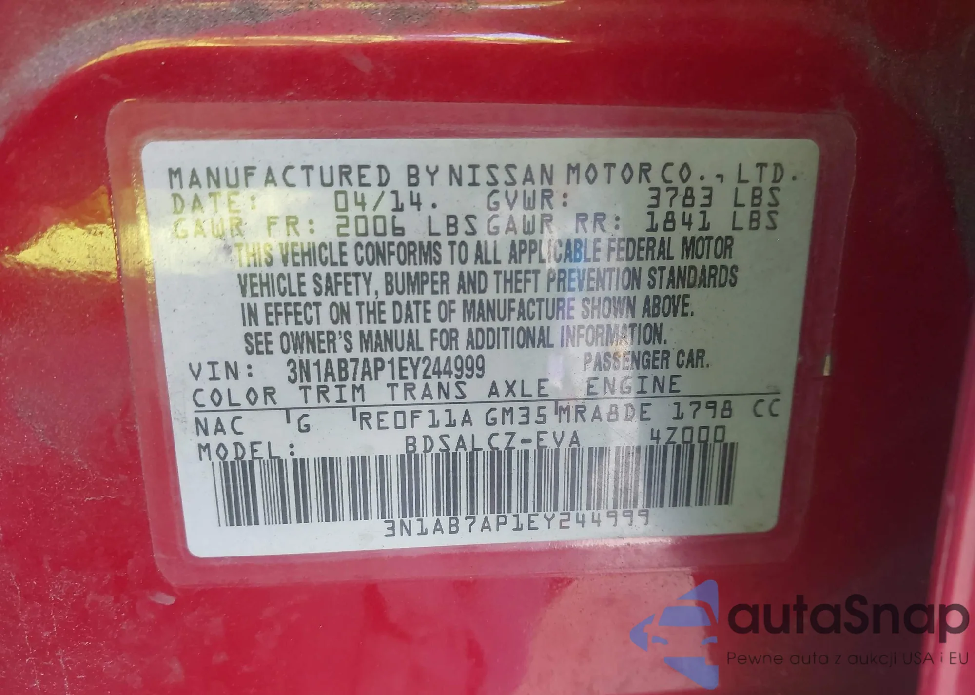 LOT: 42829789 VIN: 3N1AB7AP1EY244999