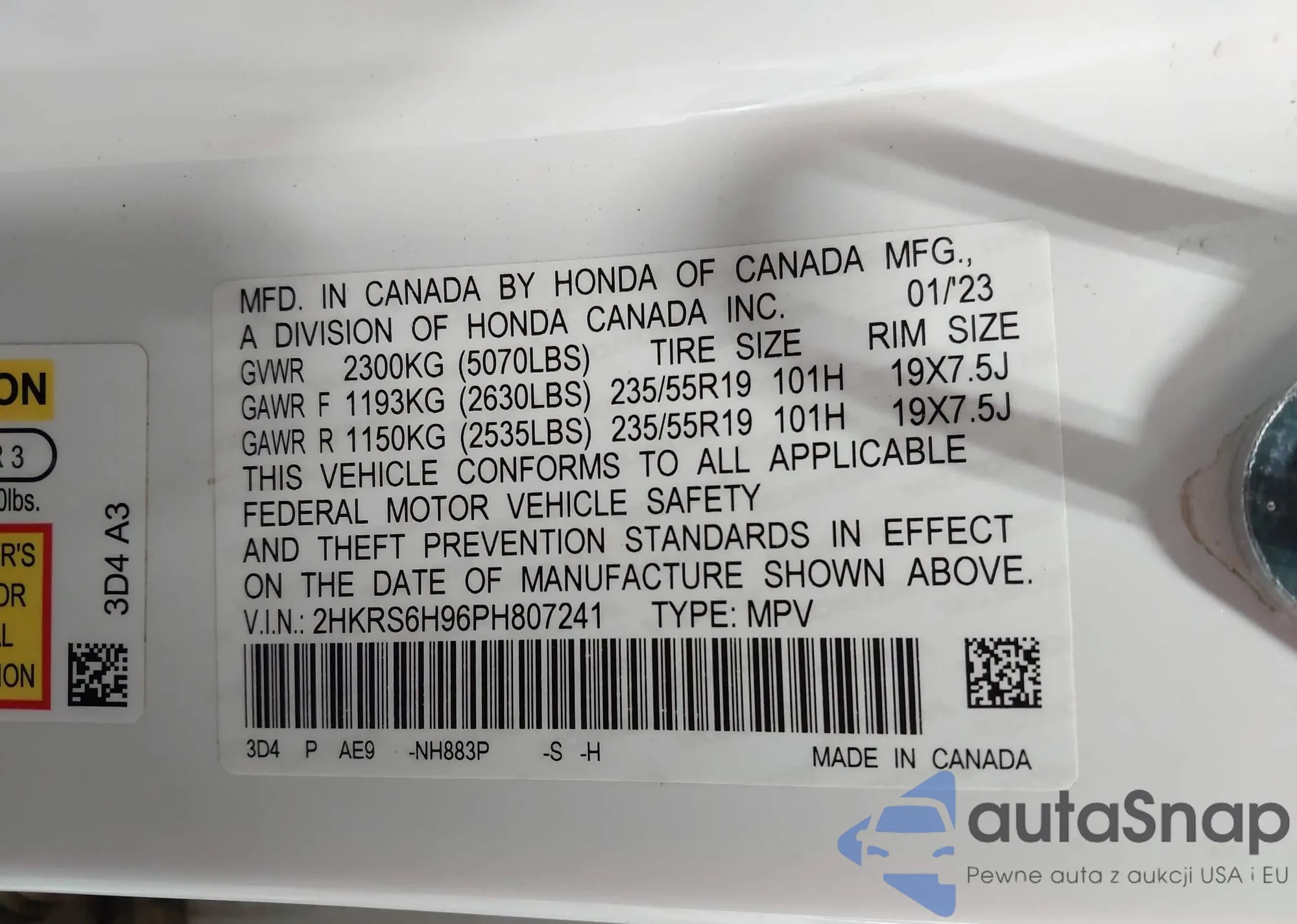 • VIN 2HKRS6H96PH807241