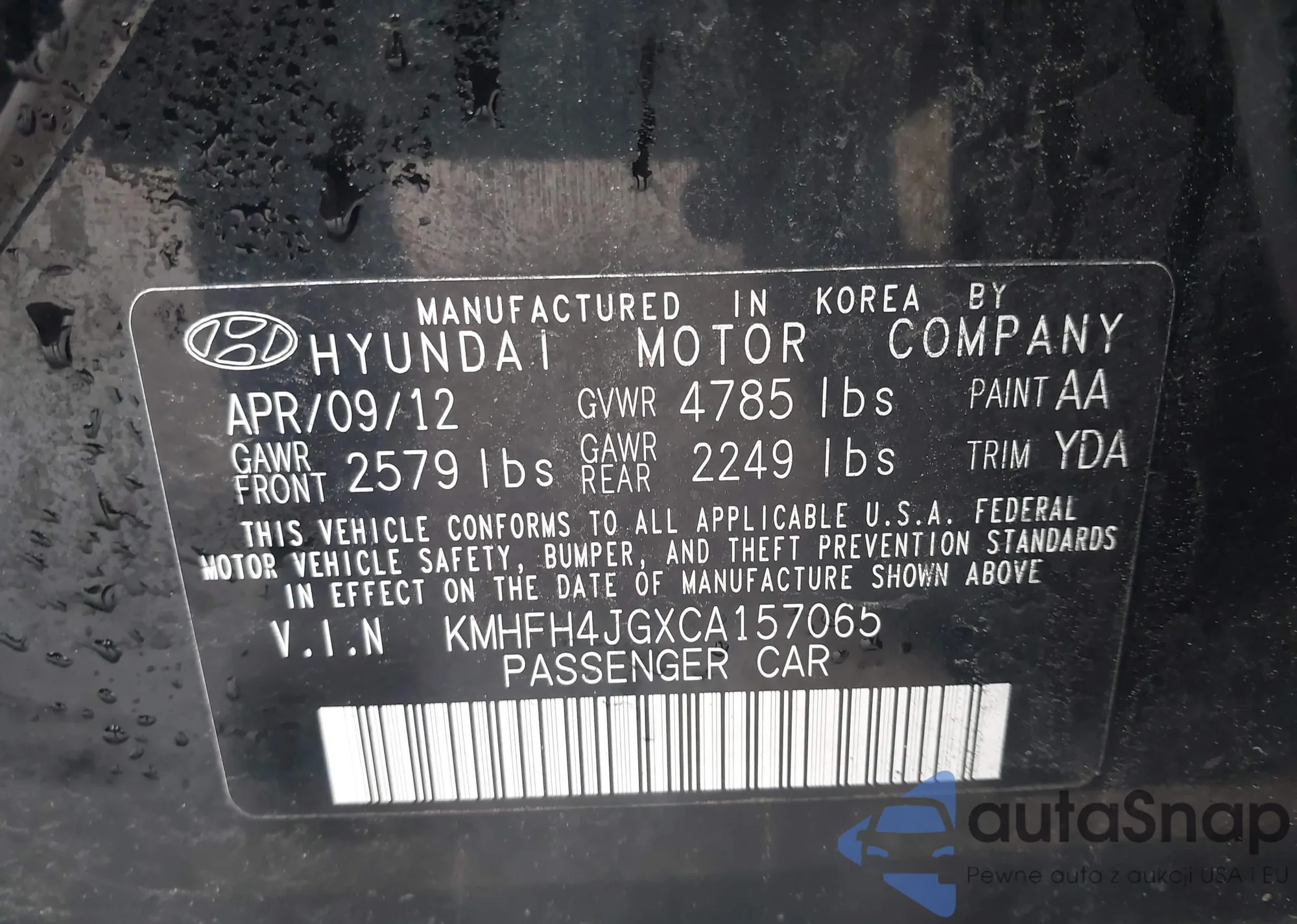 LOT: 43004523 VIN: KMHFH4JGXCA157065