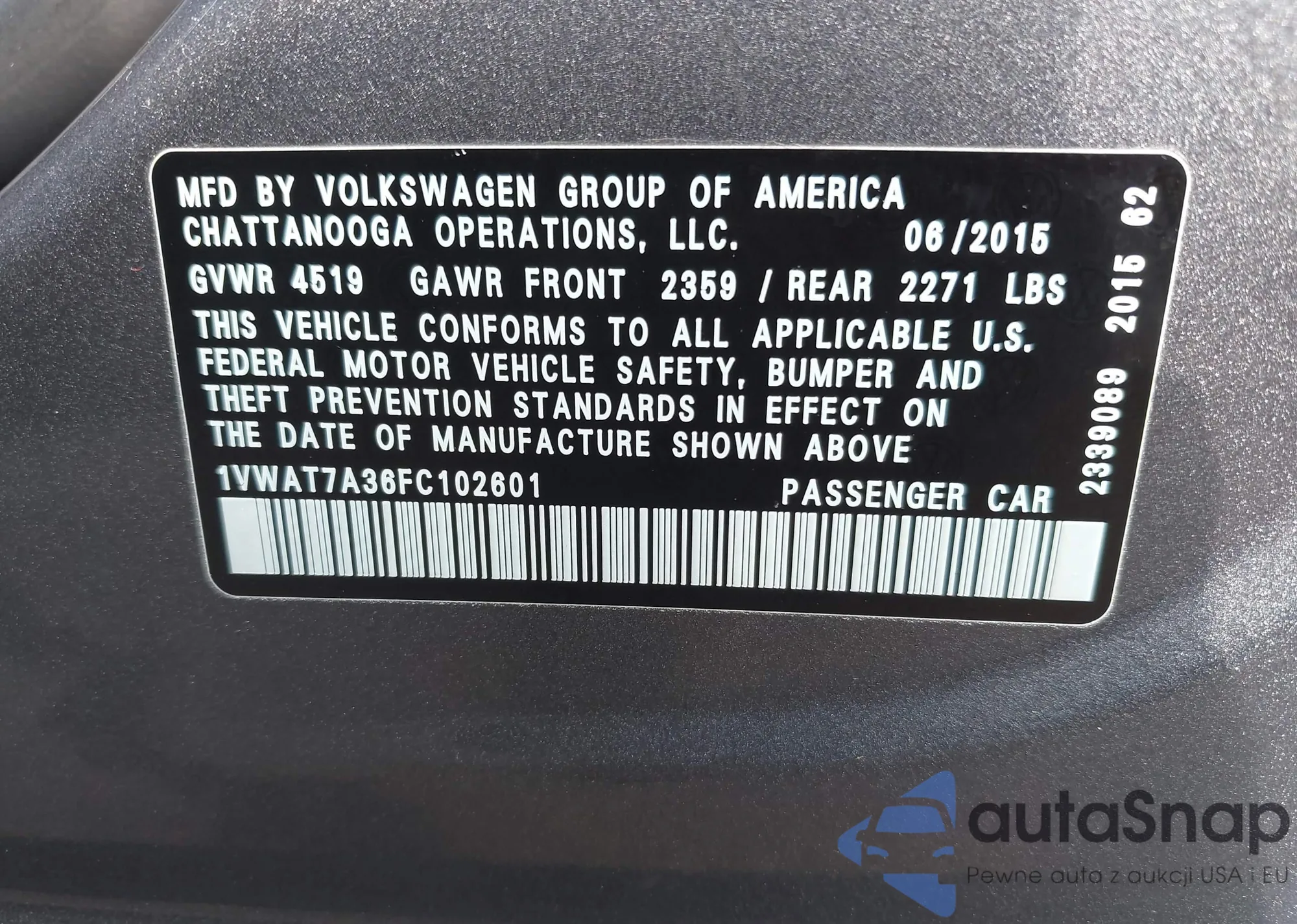 LOT: 42751629 VIN: 1VWAT7A36FC102601