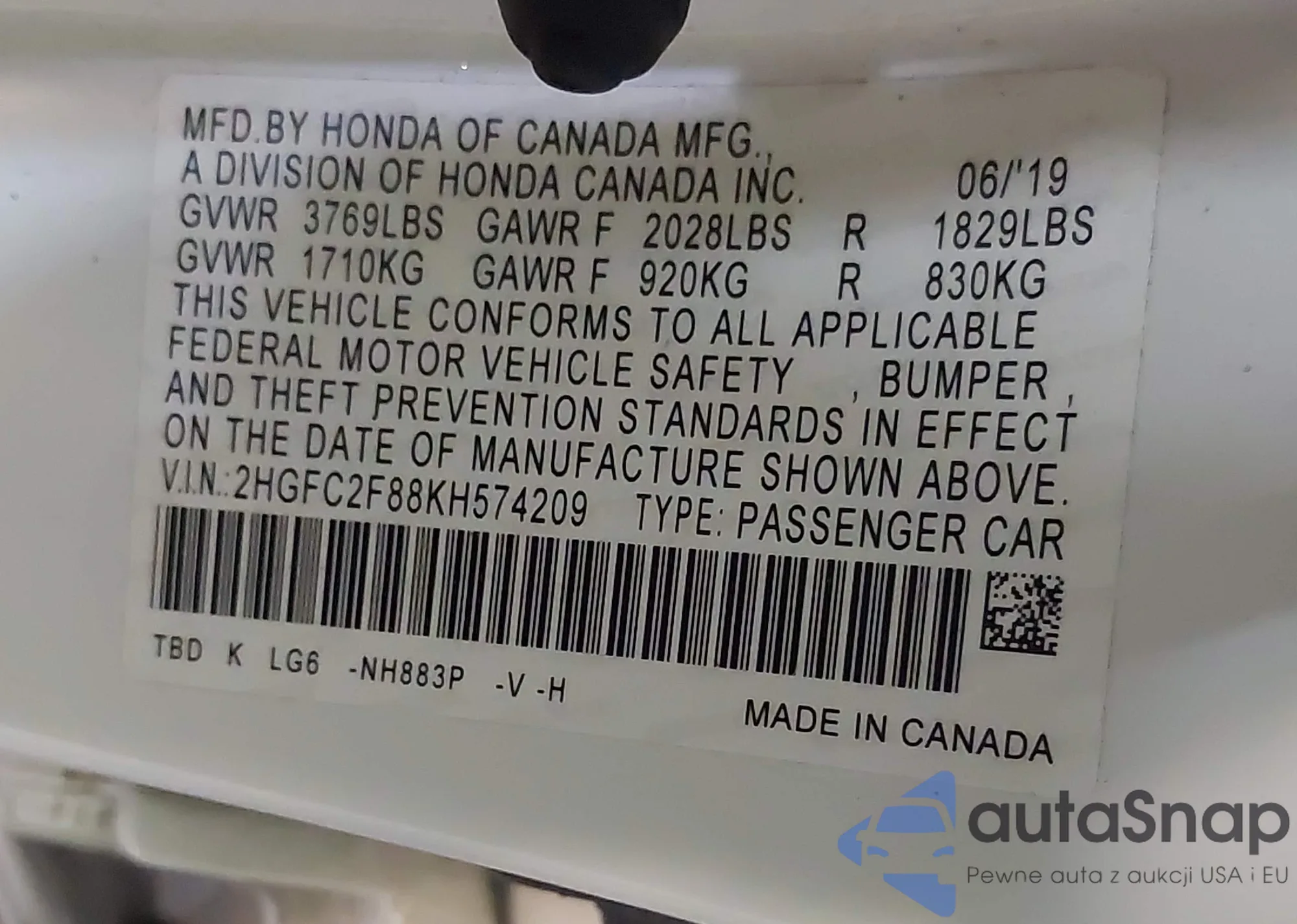 • VIN 2HGFC2F88KH574209