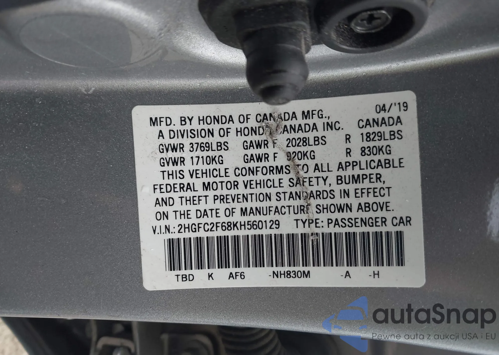 • VIN 2HGFC2F68KH560129