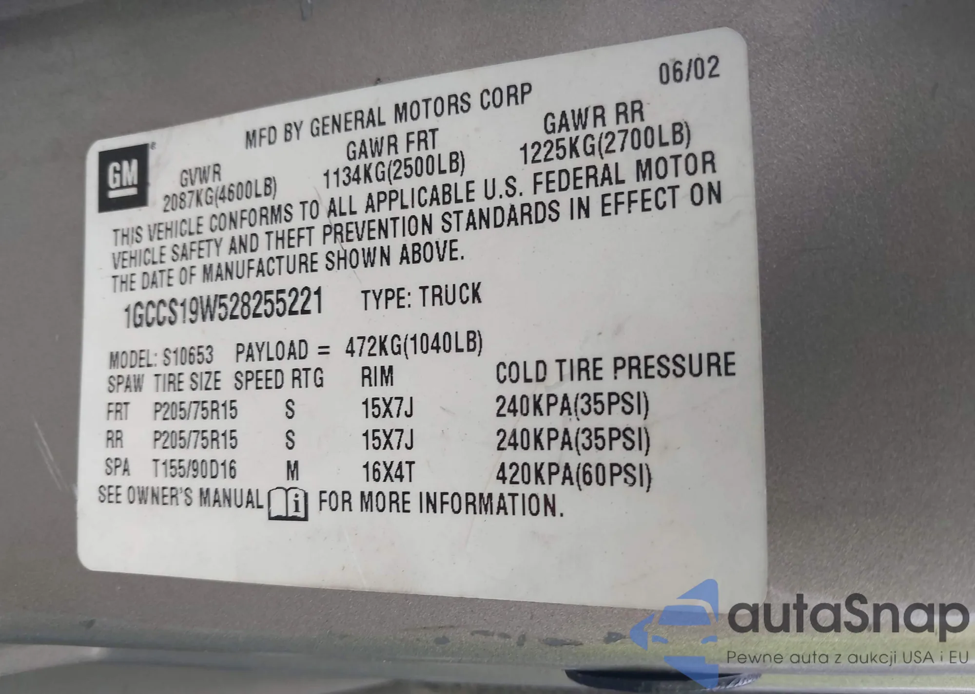 LOT: 42926046 VIN: 1GCCS19W528255221