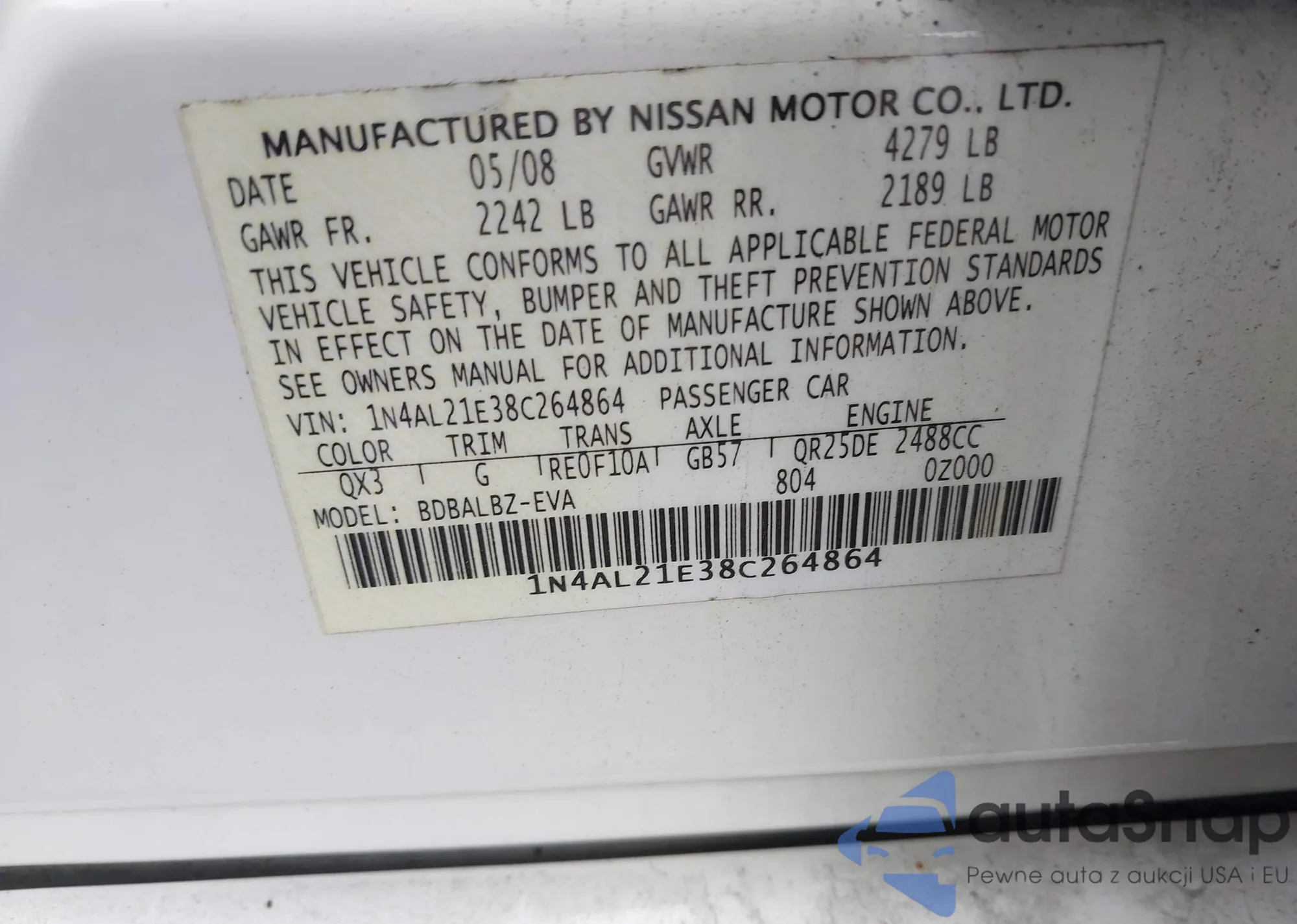 LOT: 42888735 VIN: 1N4AL21E38C264864