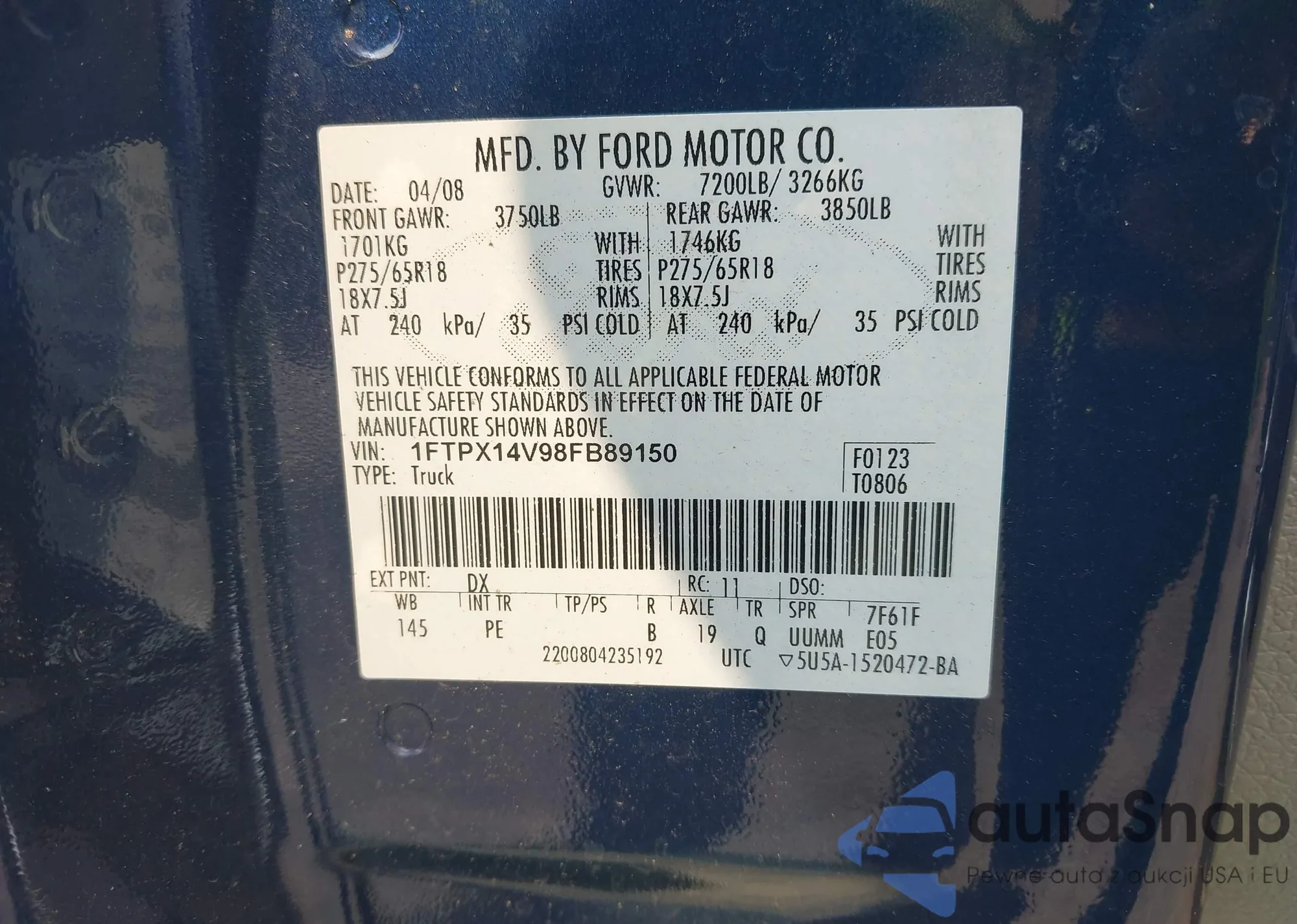 LOT: 42908710 VIN: 1FTPX14V98FB89150