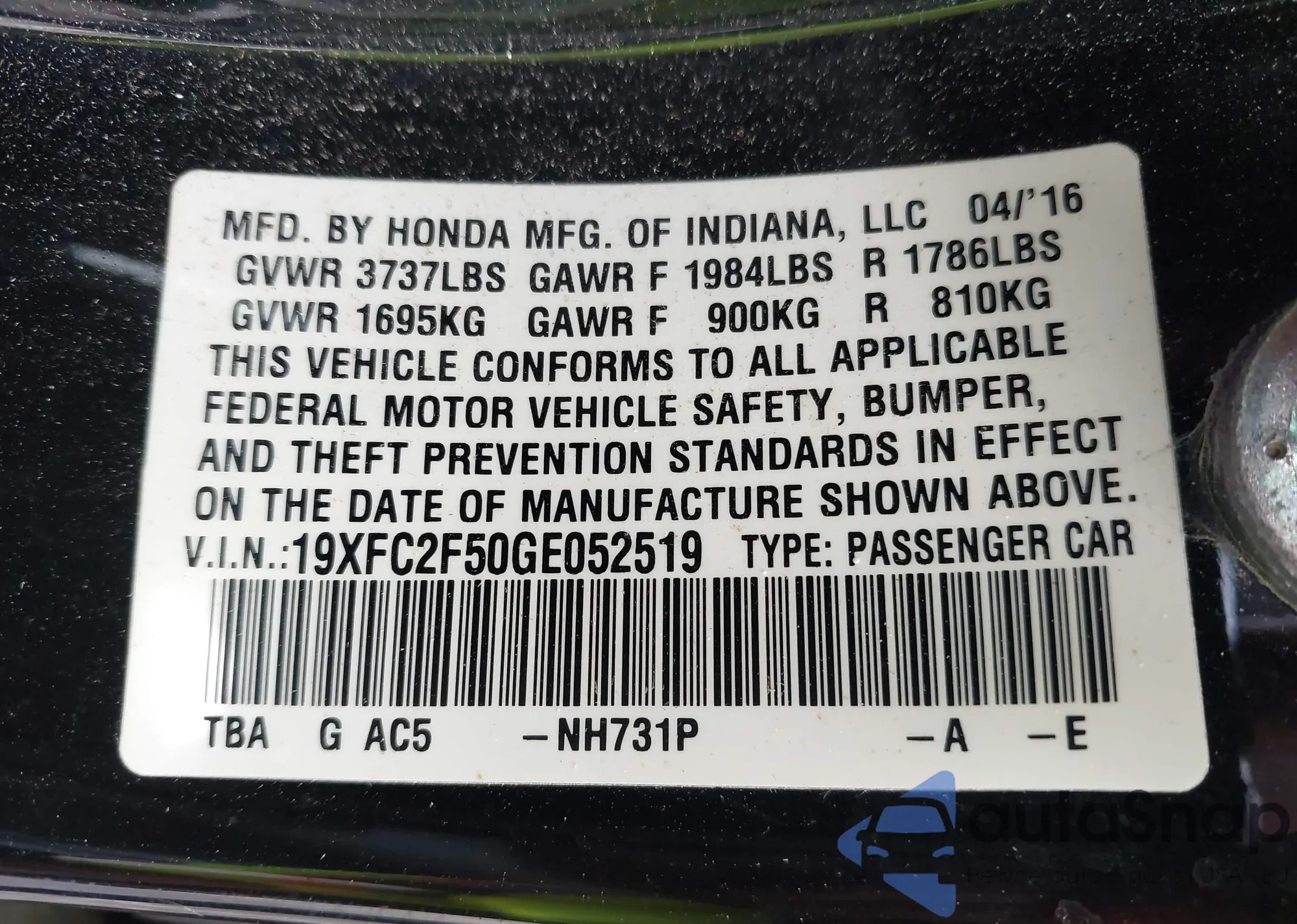 • VIN 19XFC2F50GE052519