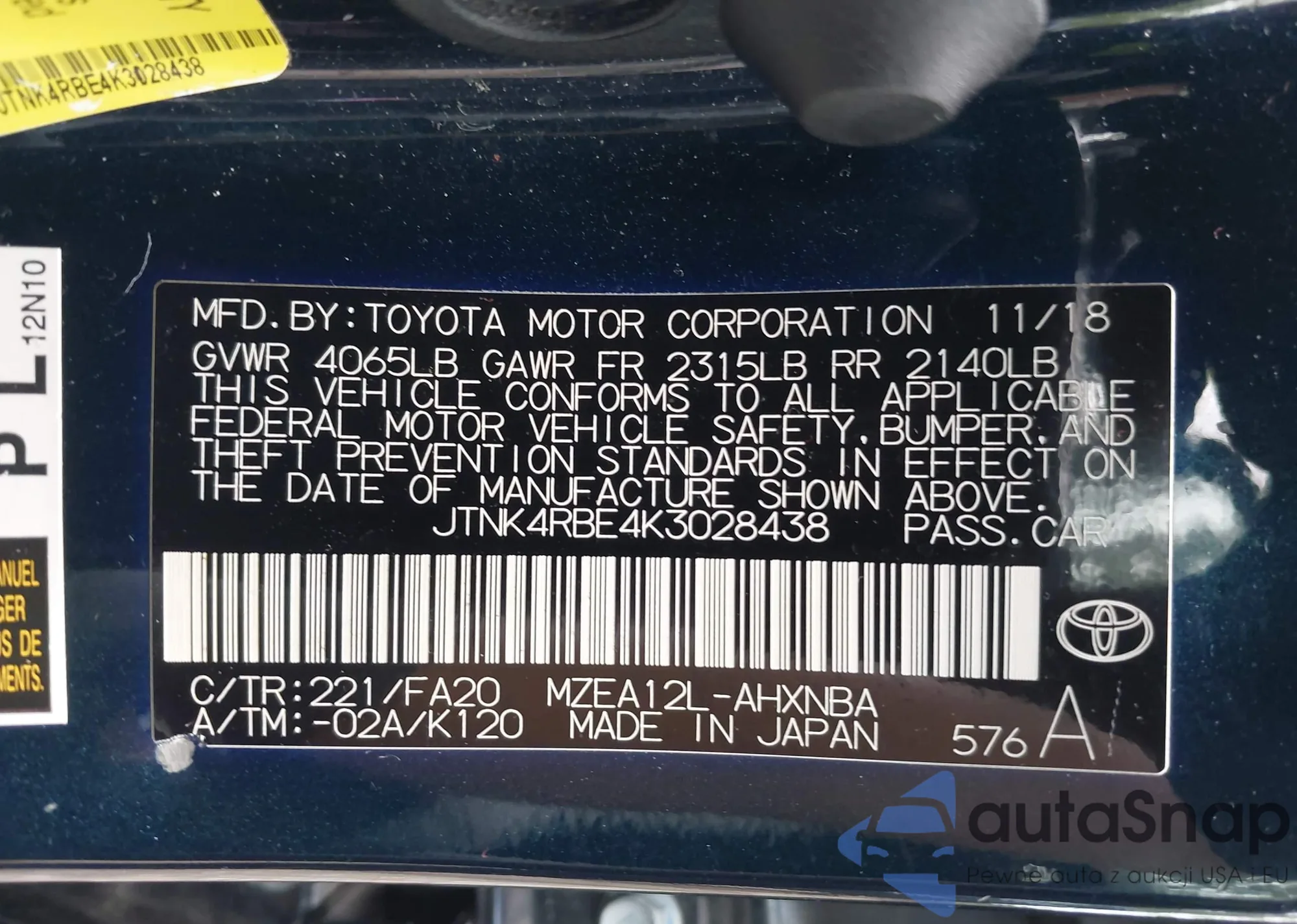 LOT: 42717179 VIN: JTNK4RBE4K3028438