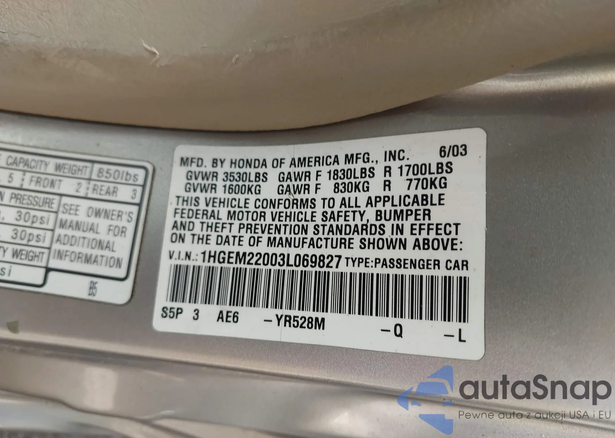 LOT: 42764303 VIN: 1HGEM22003L069827