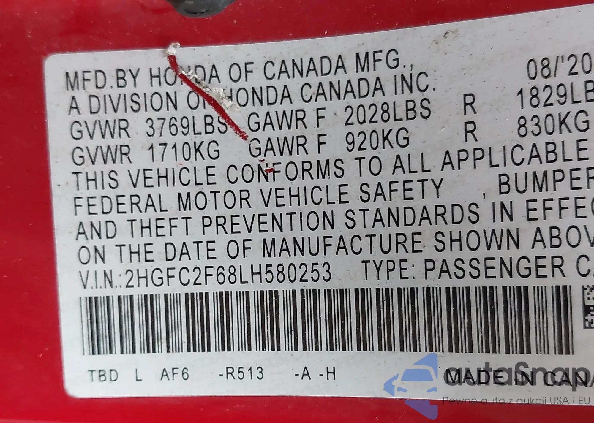 LOT: 42822833 VIN: 2HGFB2F54DH504721