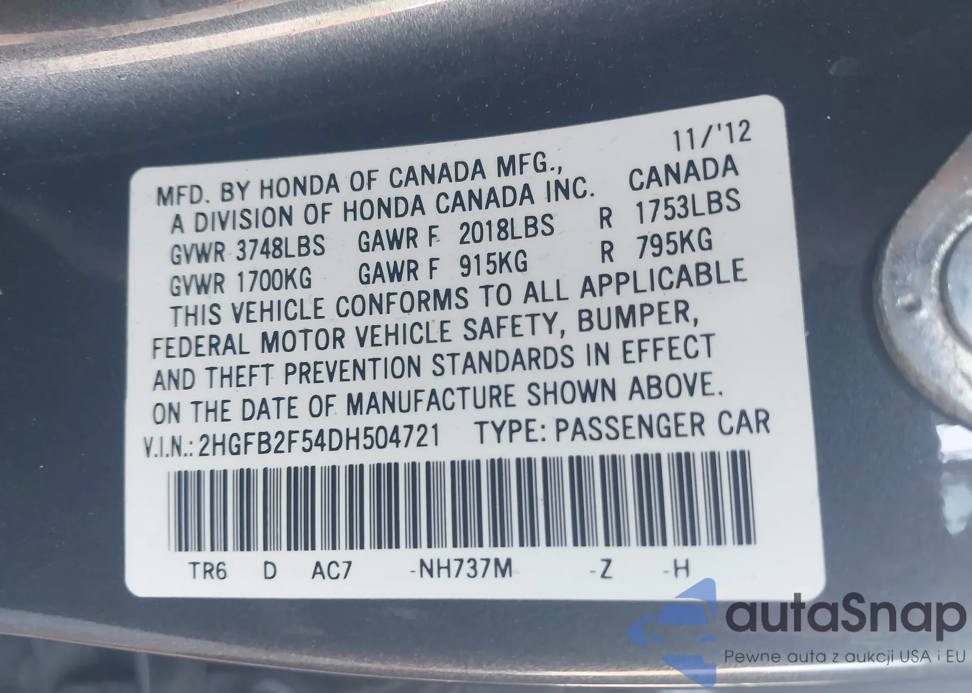 • VIN 2HGFB2F54DH504721