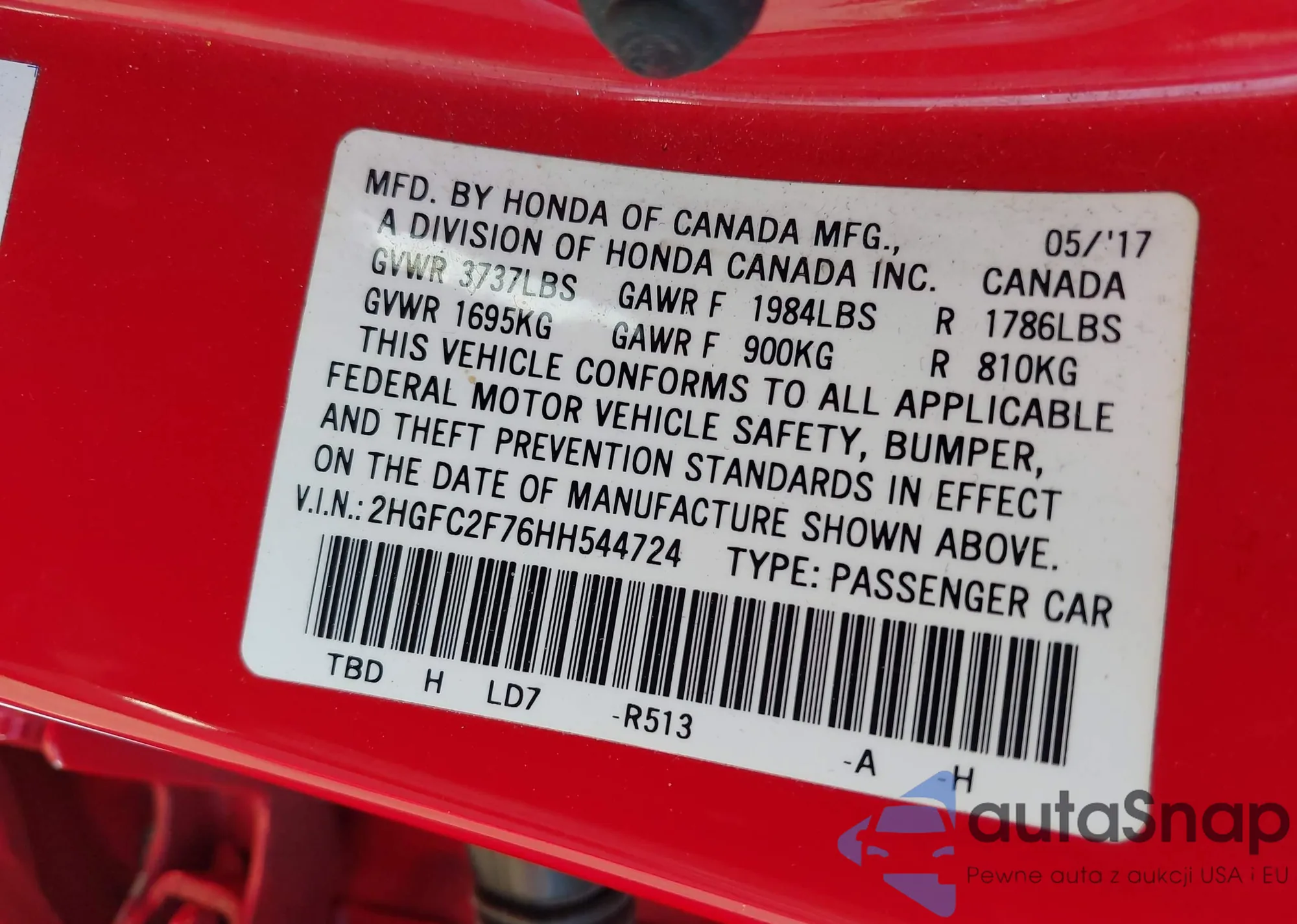 LOT: 42977918 VIN: 2HGFC2F76HH544724