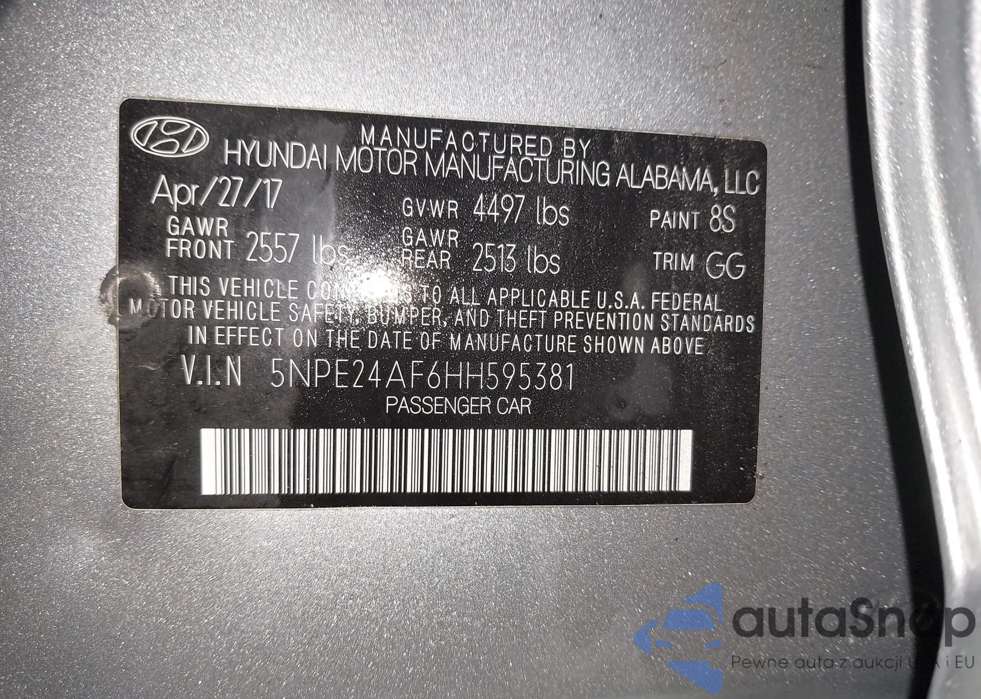LOT: 42707449 VIN: 5NPE24AF6HH595381