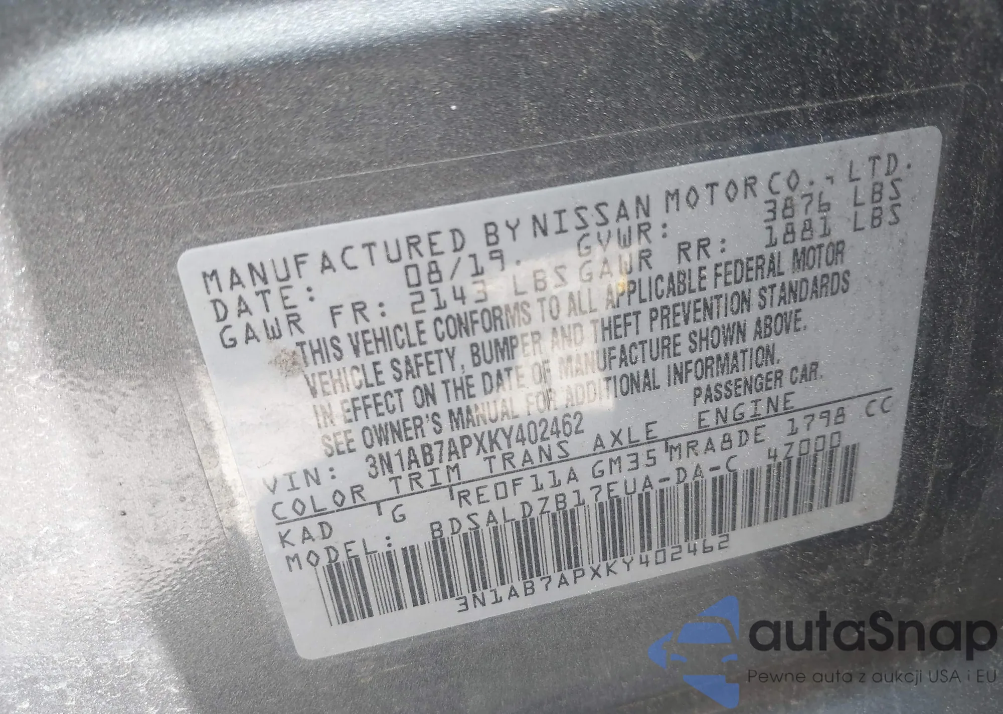 LOT: 42434408 VIN: 3N1AB7APXKY402462