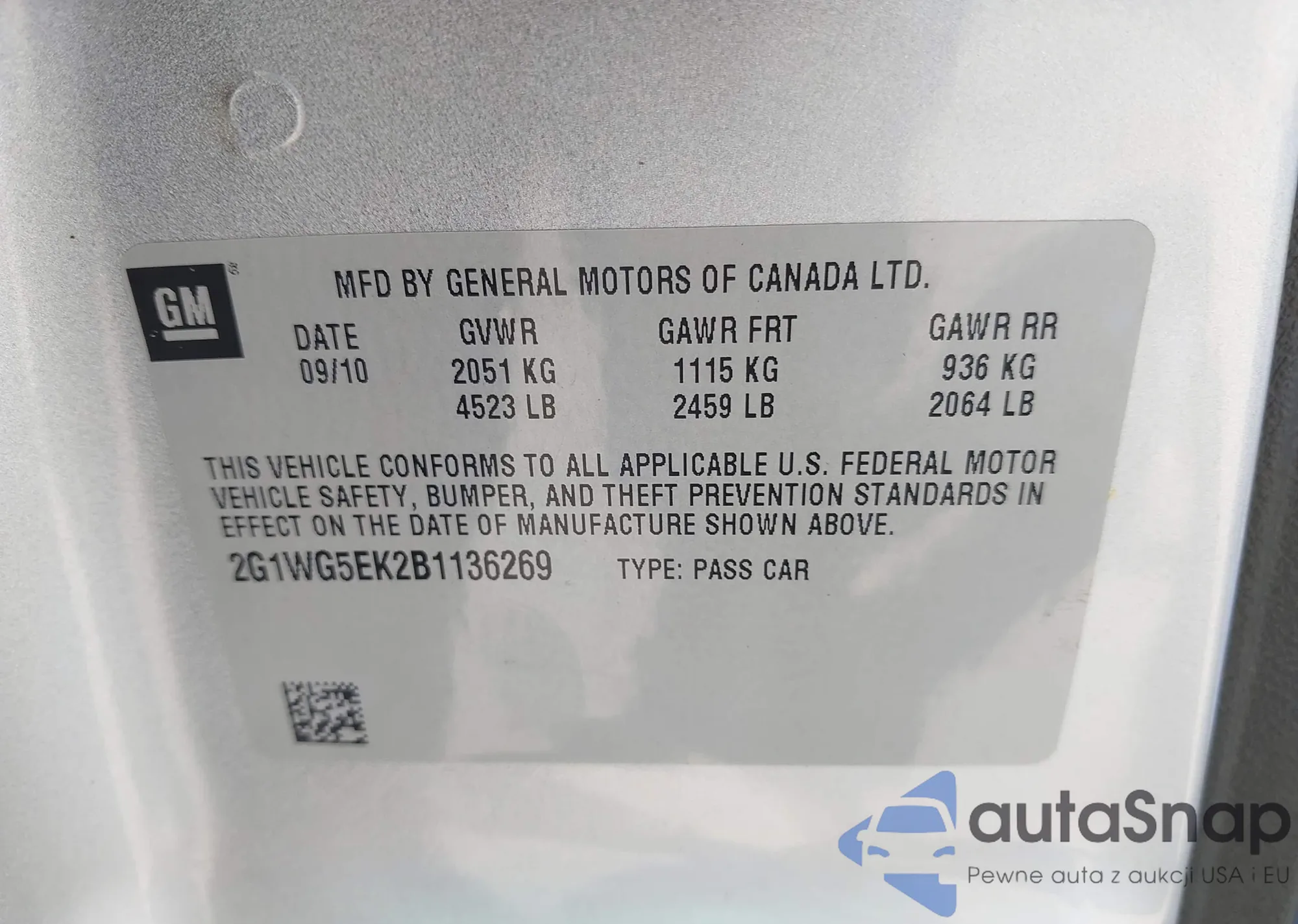 LOT: 42948657 VIN: 2G1WG5EK2B1136269