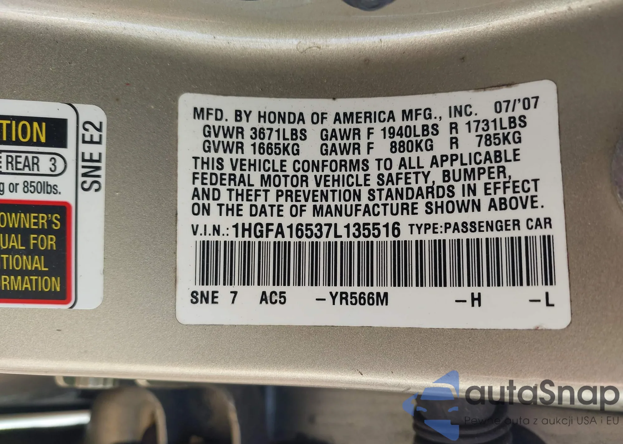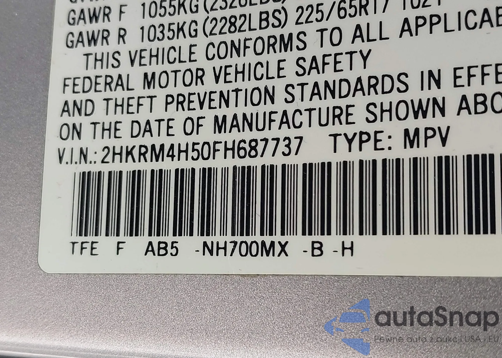 • VIN 2HKRM4H50FH687737