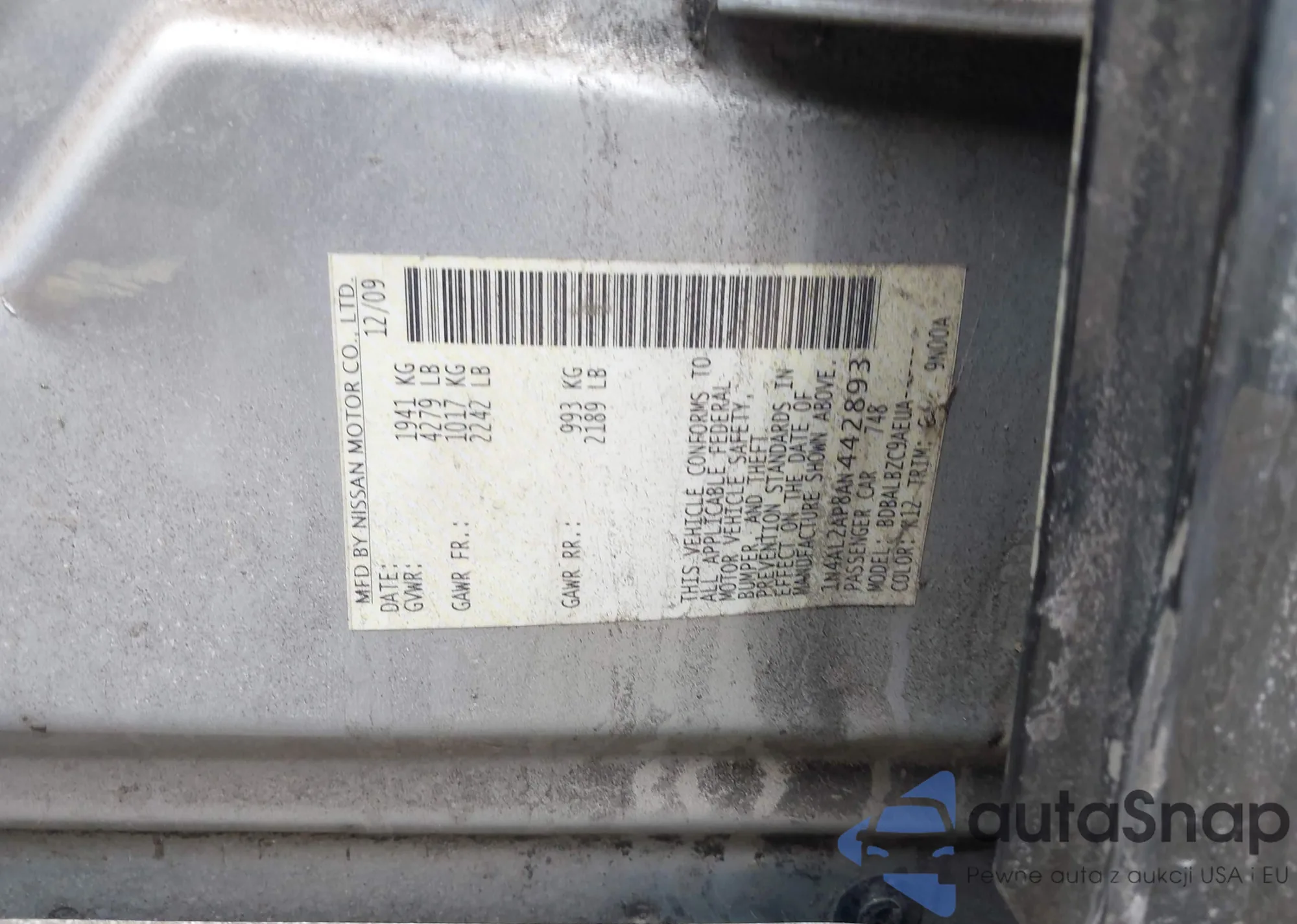 LOT: 41701311 VIN: 1N4AL2AP8AN442893