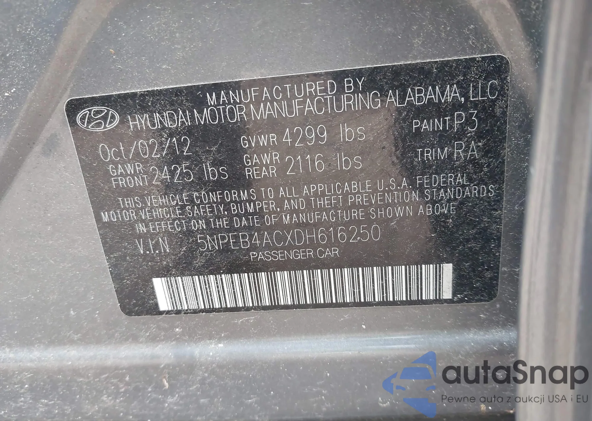 LOT: 43087477 VIN: 5NPEB4ACXDH616250