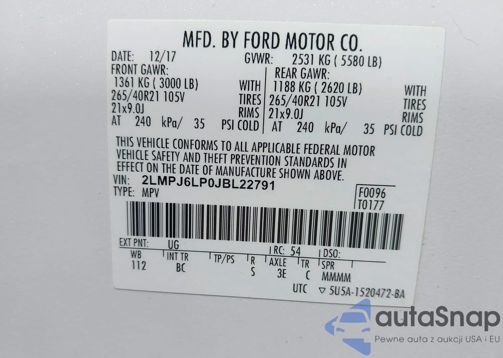 LOT: 42729227 VIN: 2LMPJ6LP0JBL22791