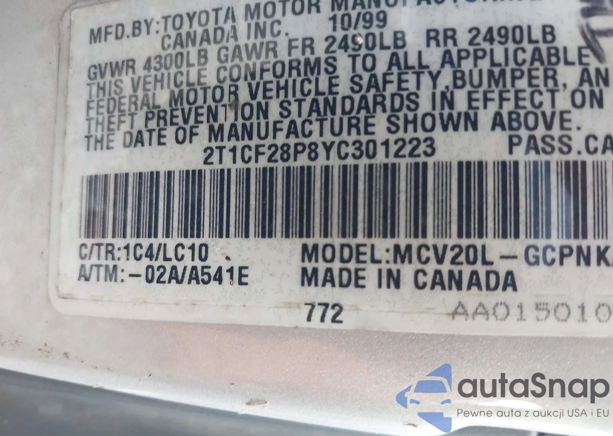 • VIN 2T1CF28P8YC301223