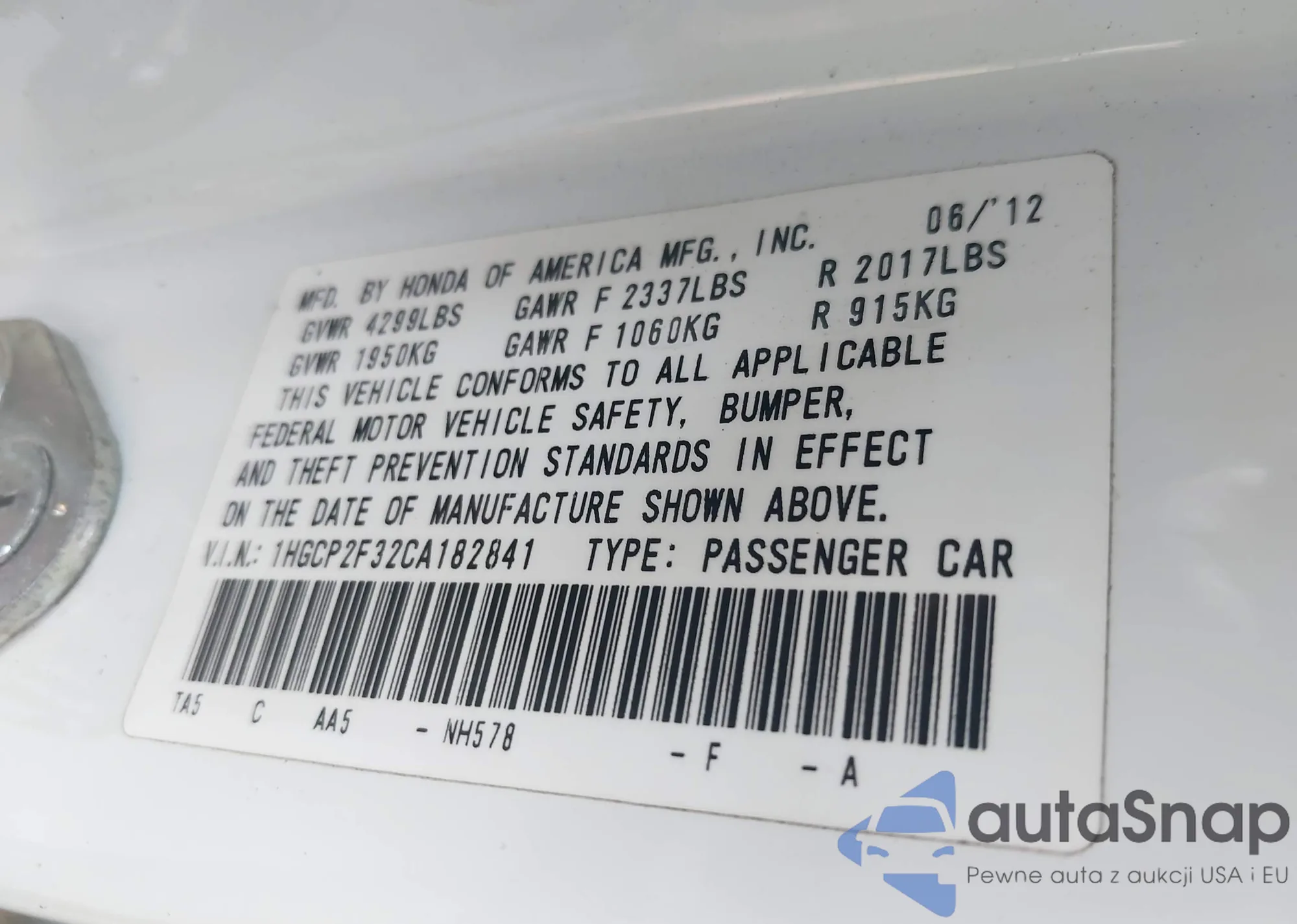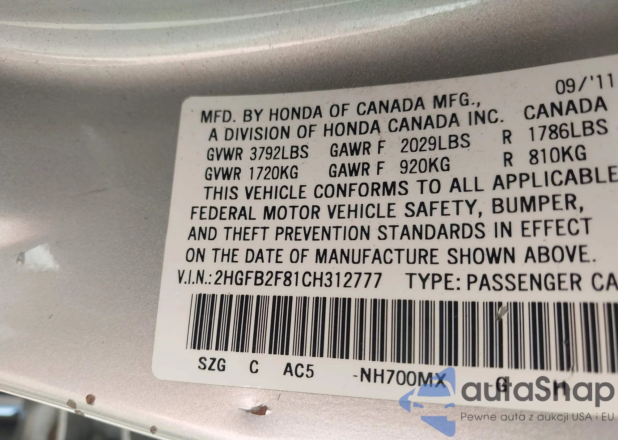 • VIN 2HGFB2F81CH312777