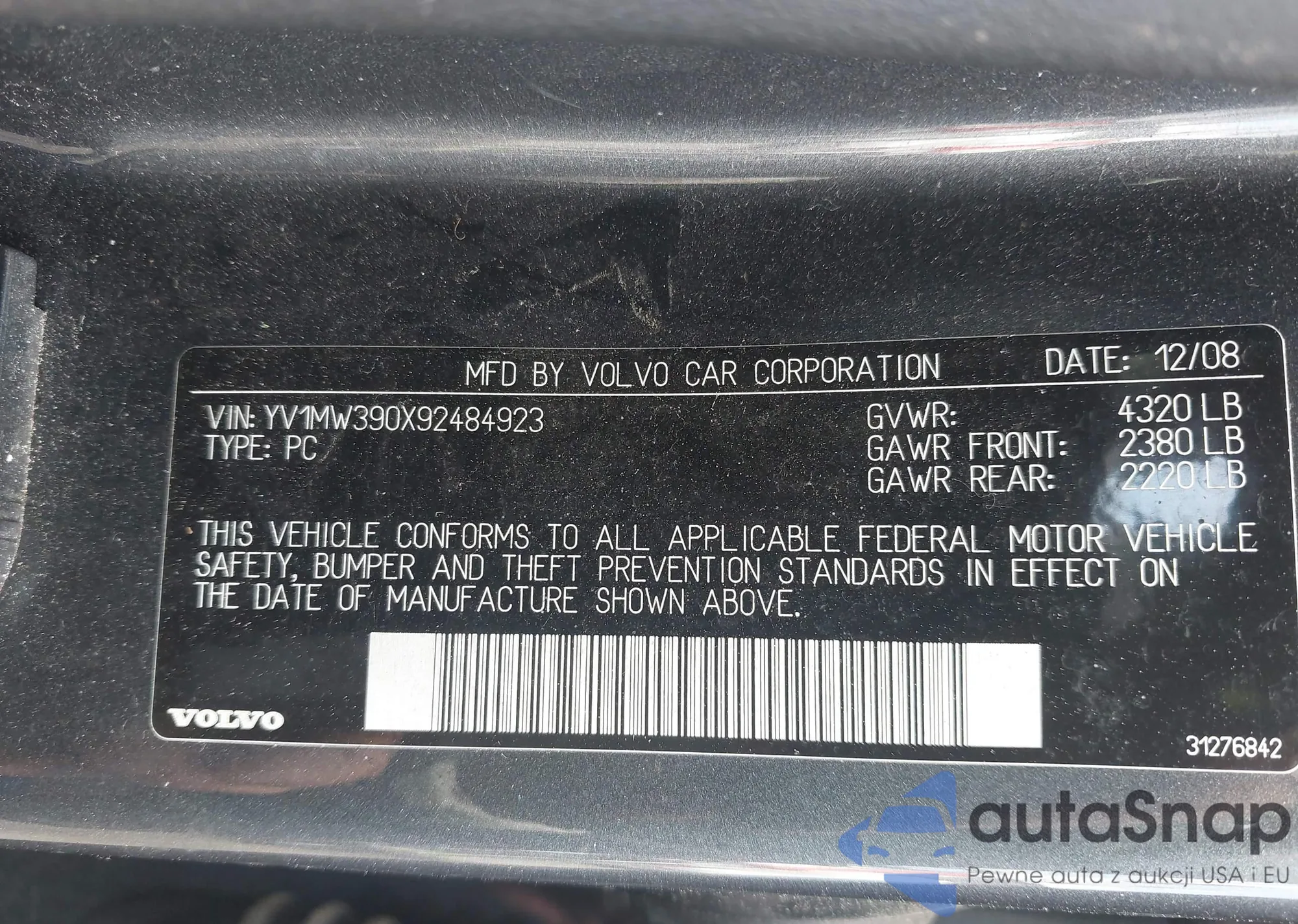 LOT: 42803911 VIN: YV1MW390X92484923