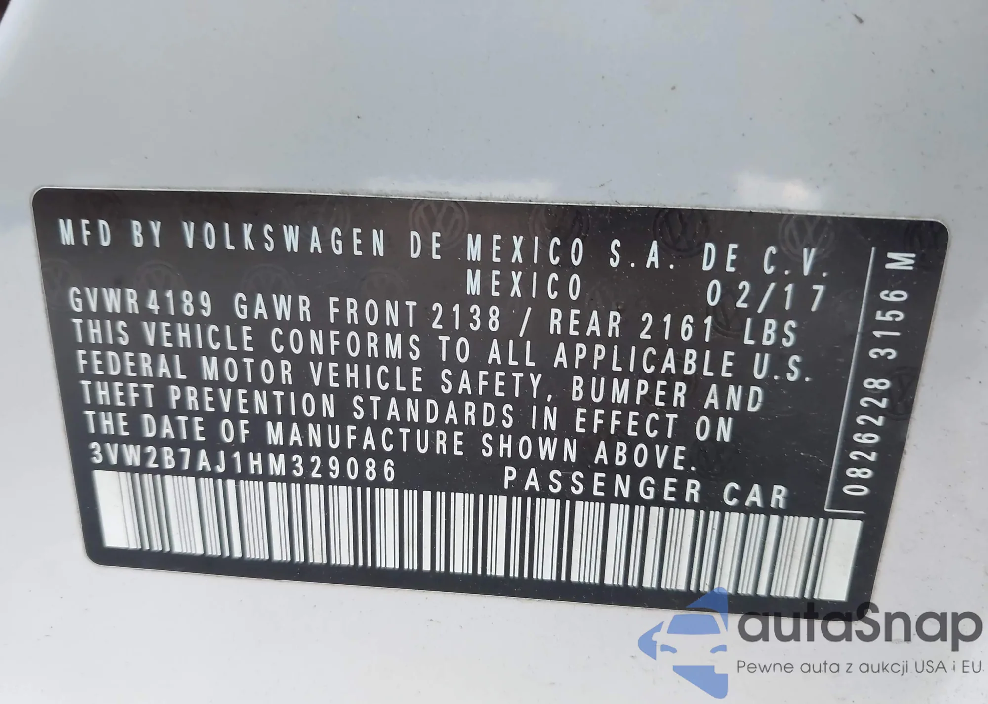 • VIN 3VW2B7AJ1HM329086